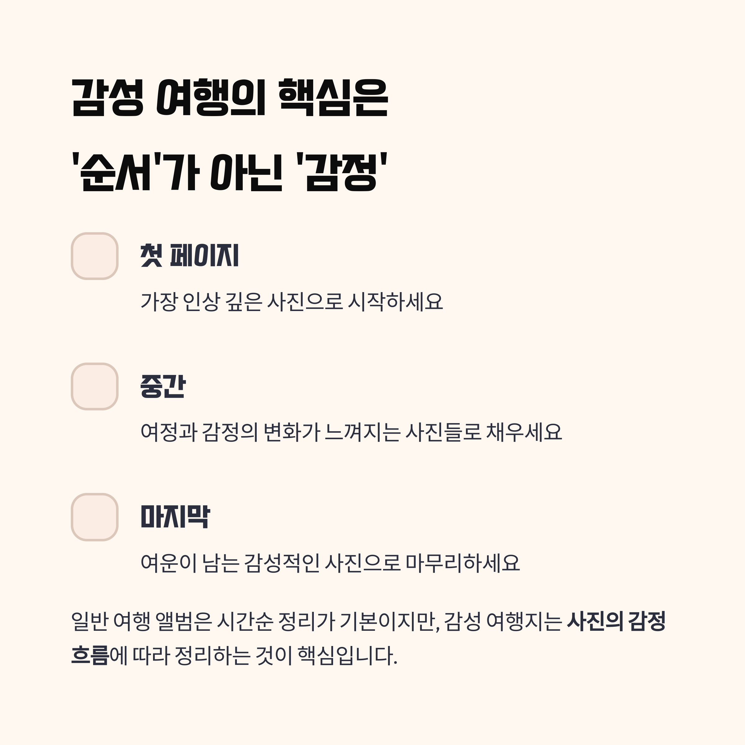 사진의 감정 흐름에 따라 정리하는 것이 핵심입니다.