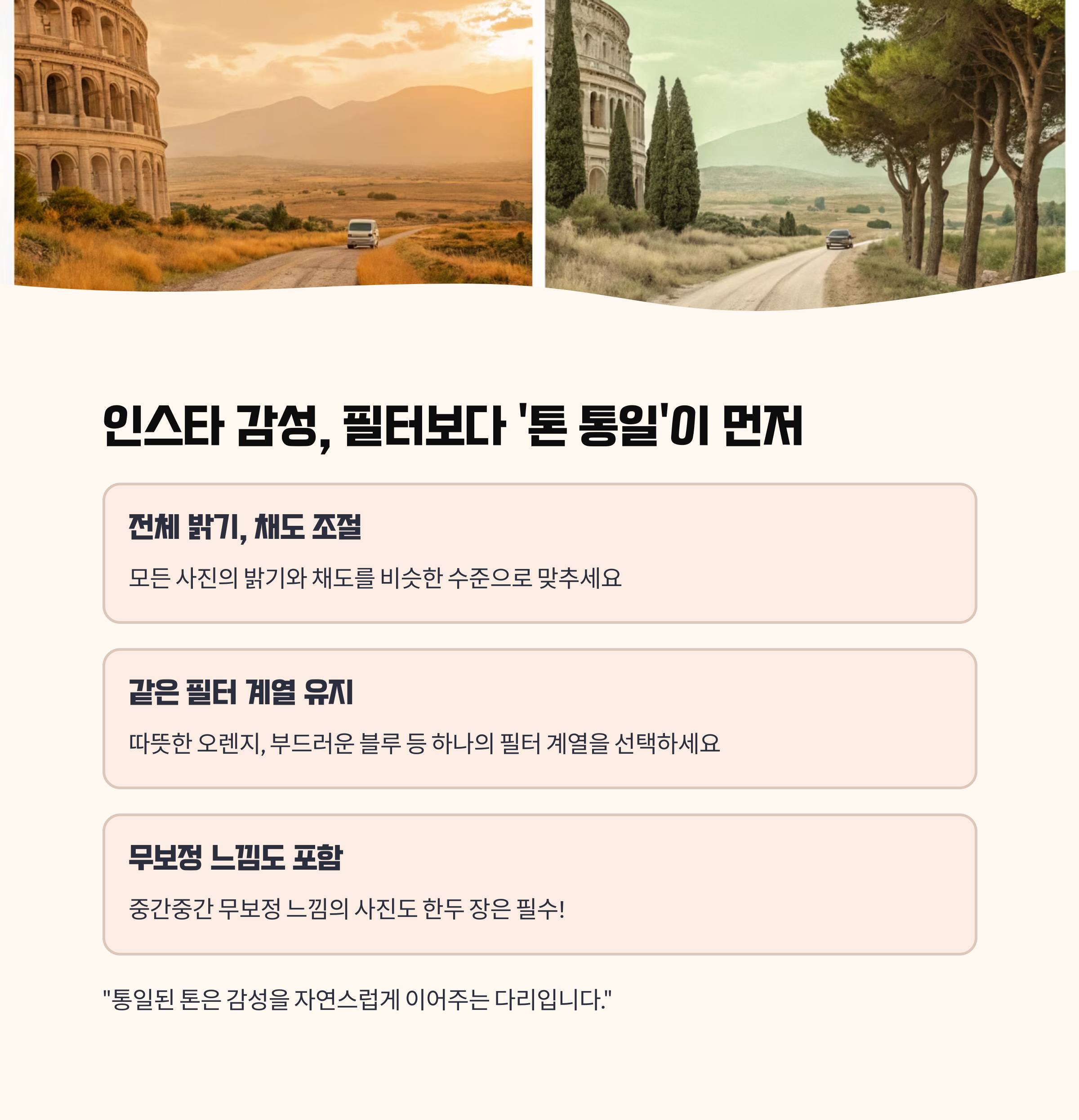- 같은 필터 계열 유지 (예: 따뜻한 오렌지, 부드러운 블루 등)