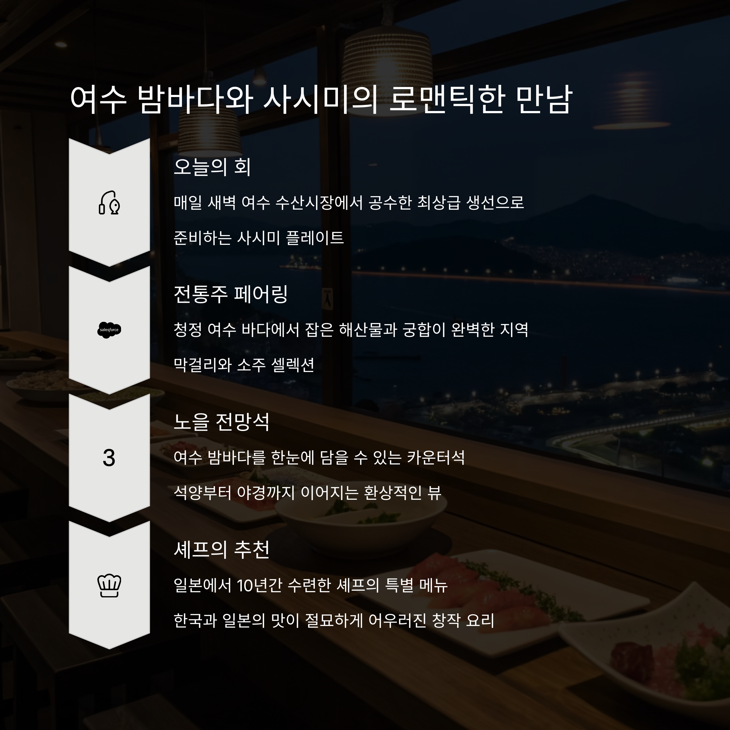 선선한 바닷바람을 맞으며 사시미 한 점, 사케 한 잔을 기울이는 순간,
