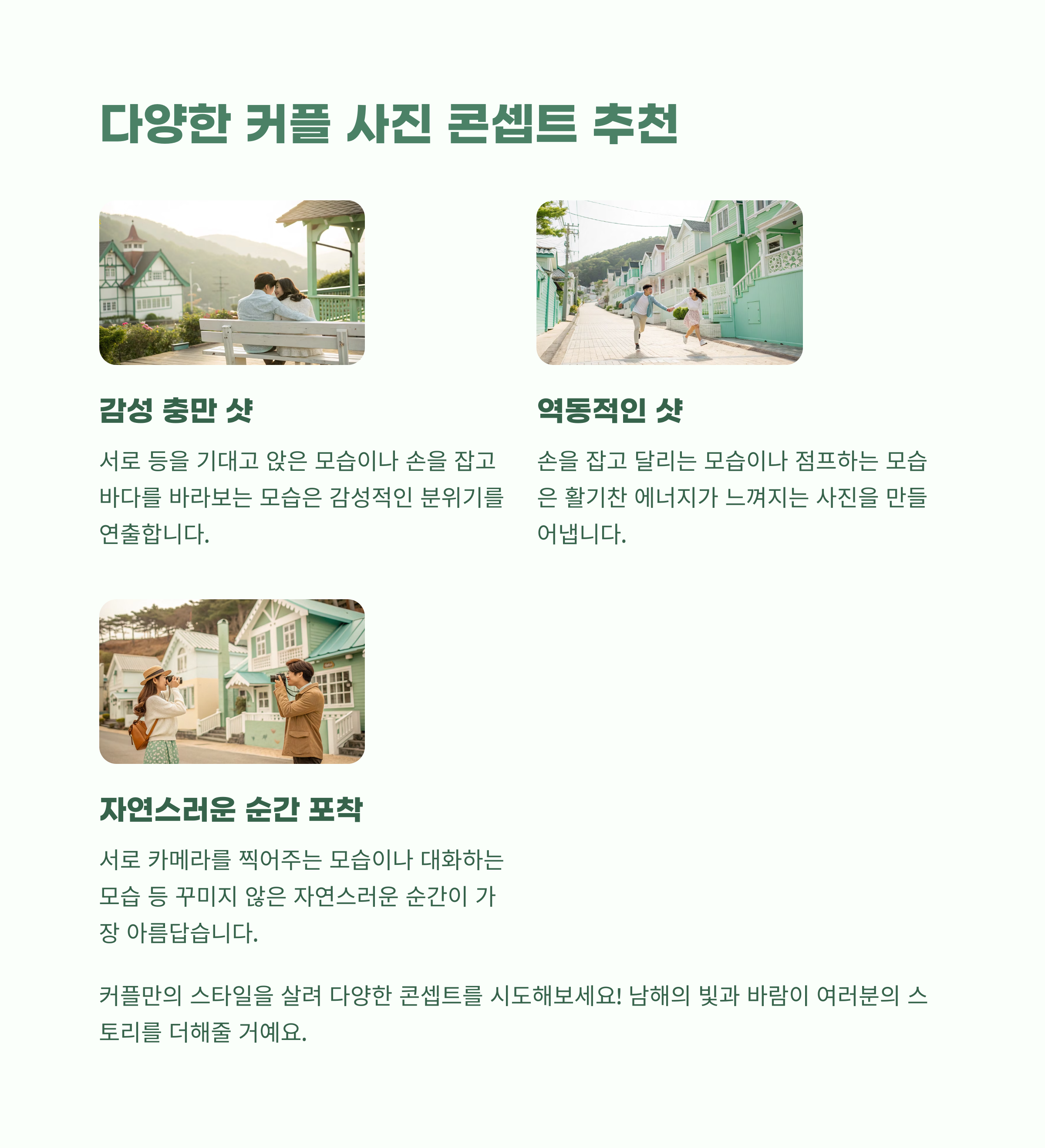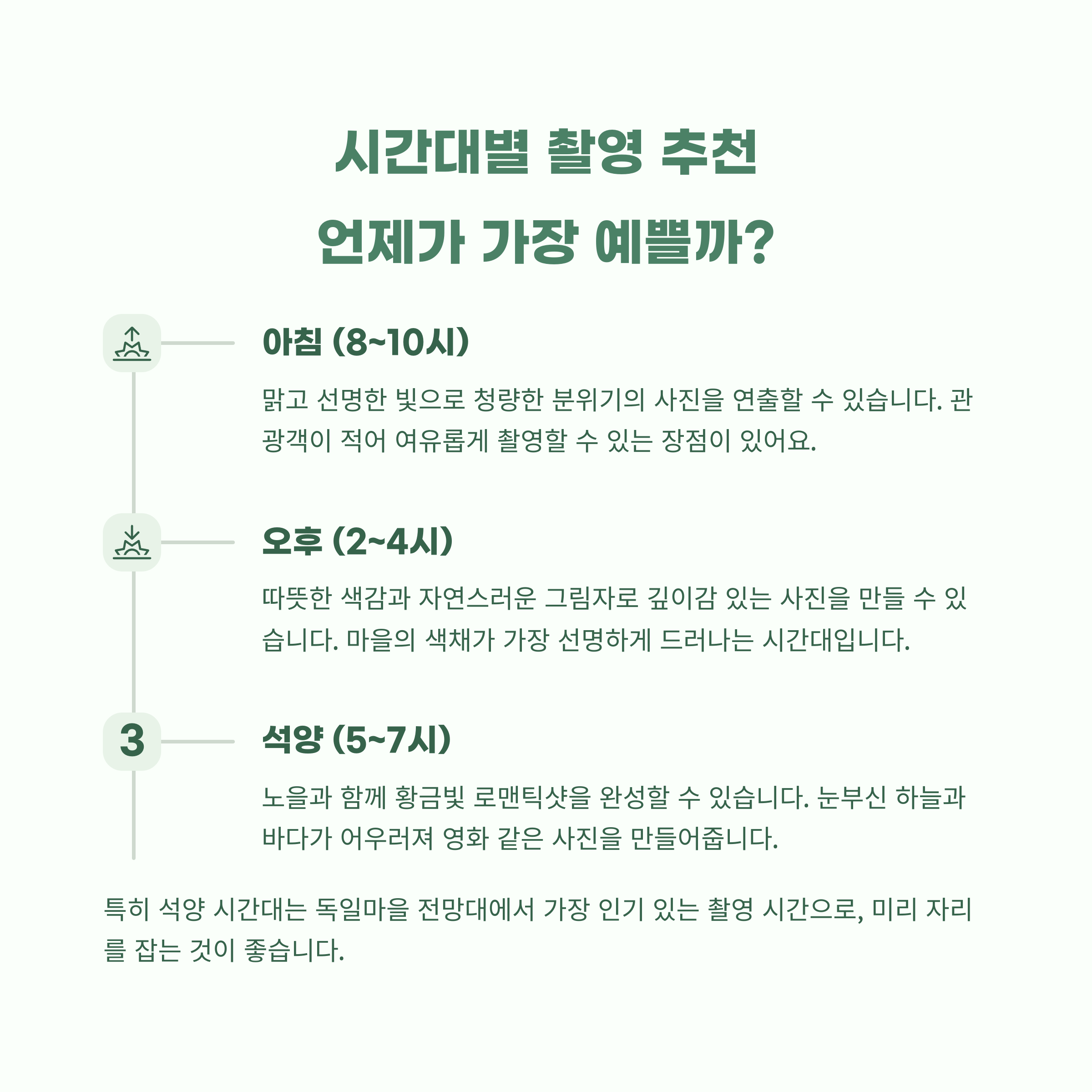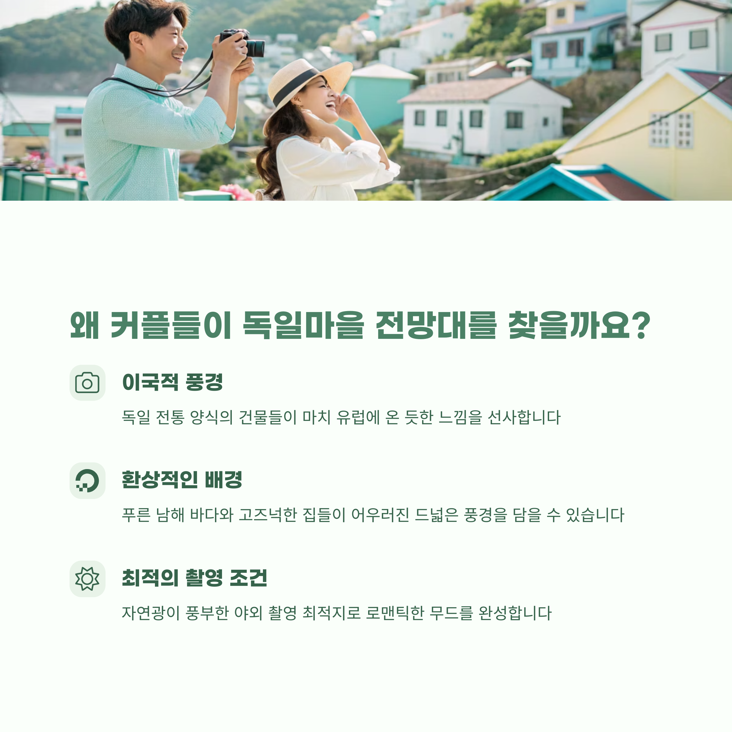 특히 '독일마을 전망대'는 푸른 바다와 고즈넉한 집들이 어우러진 환상적인 배경을 제공합니다.