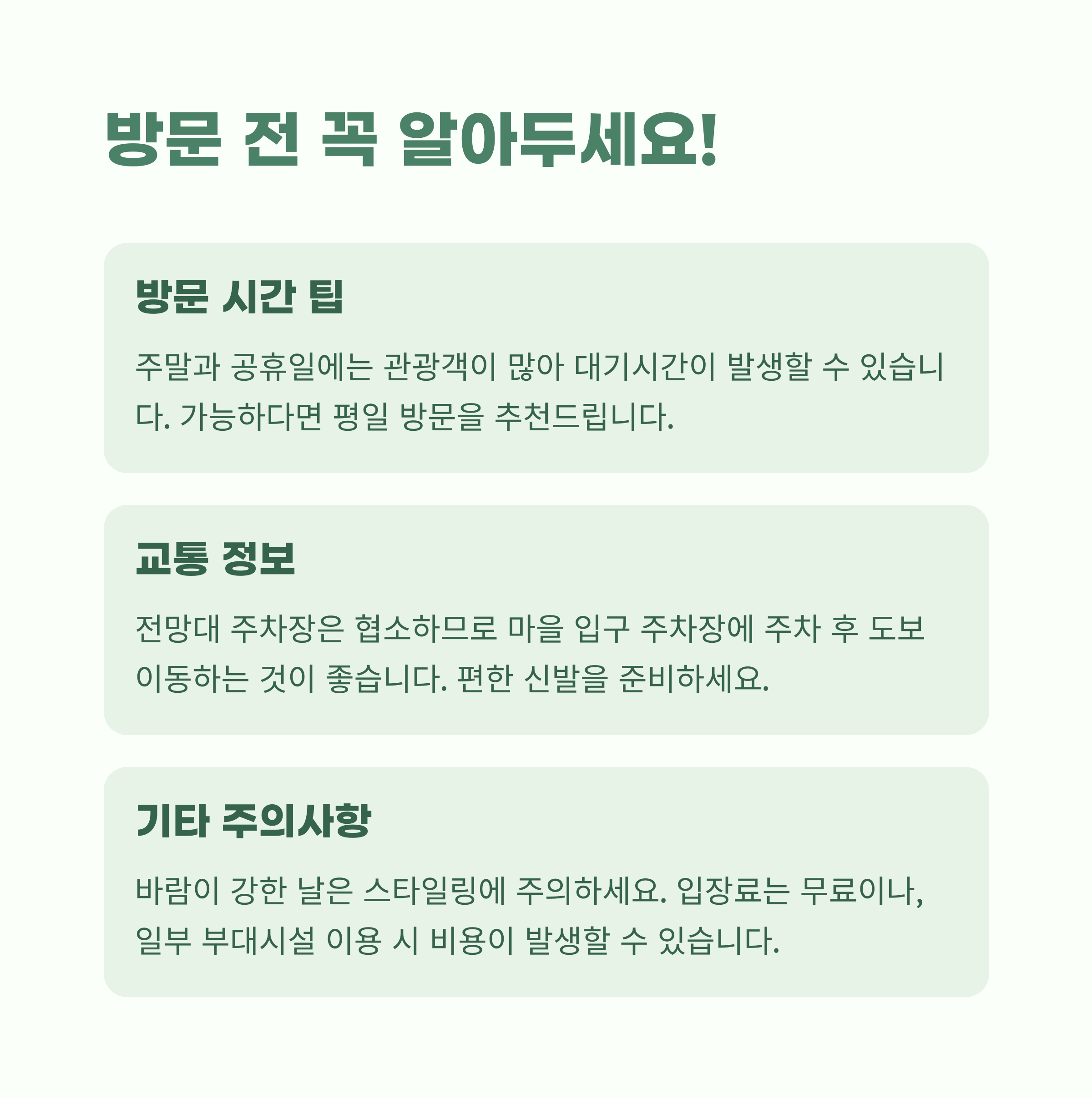 - 주말, 공휴일에는 관광객이 많아 대기시간 발생 가능