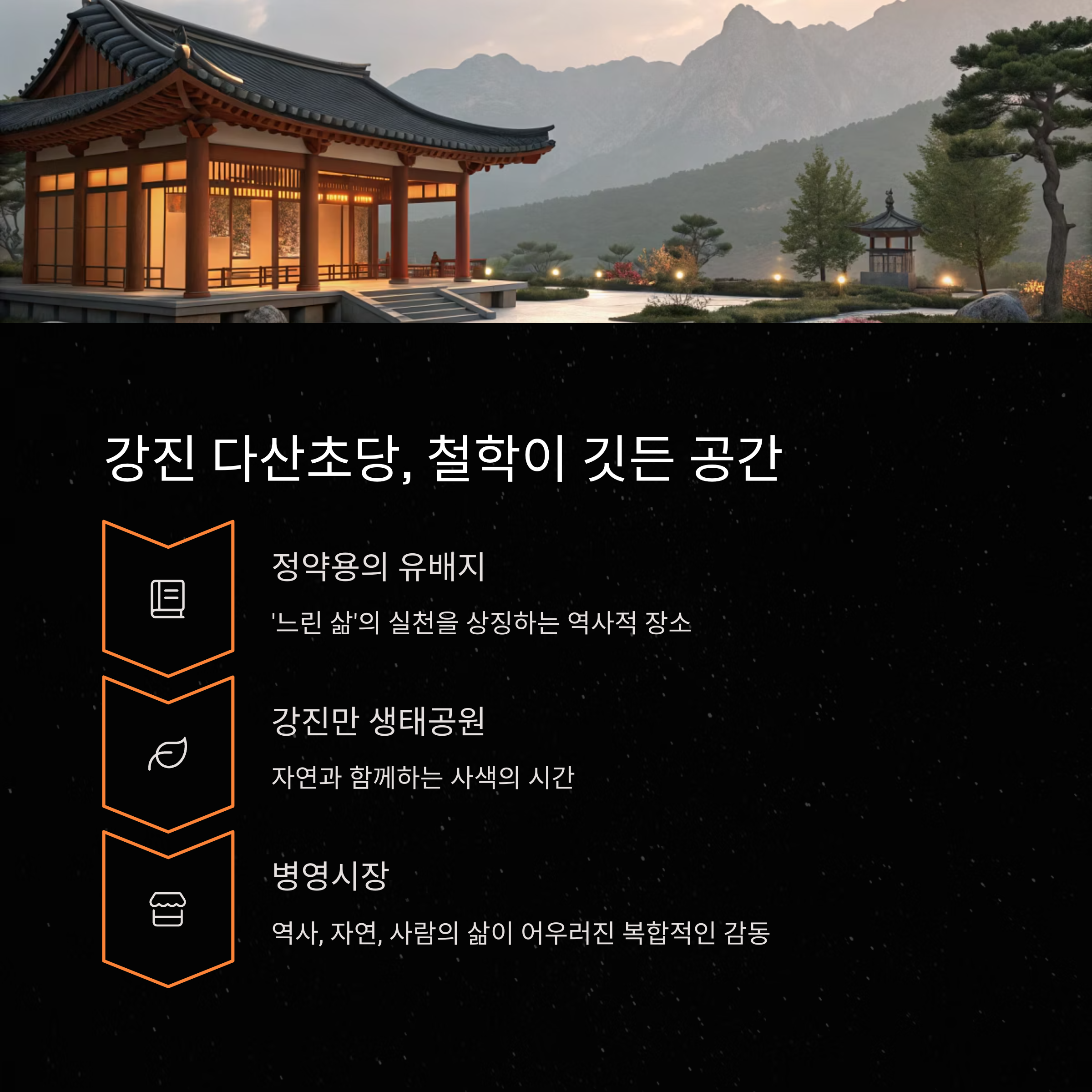 정약용이 유배 시절을 보낸 이곳은 ‘느린 삶’의 실천을 상징합니다.