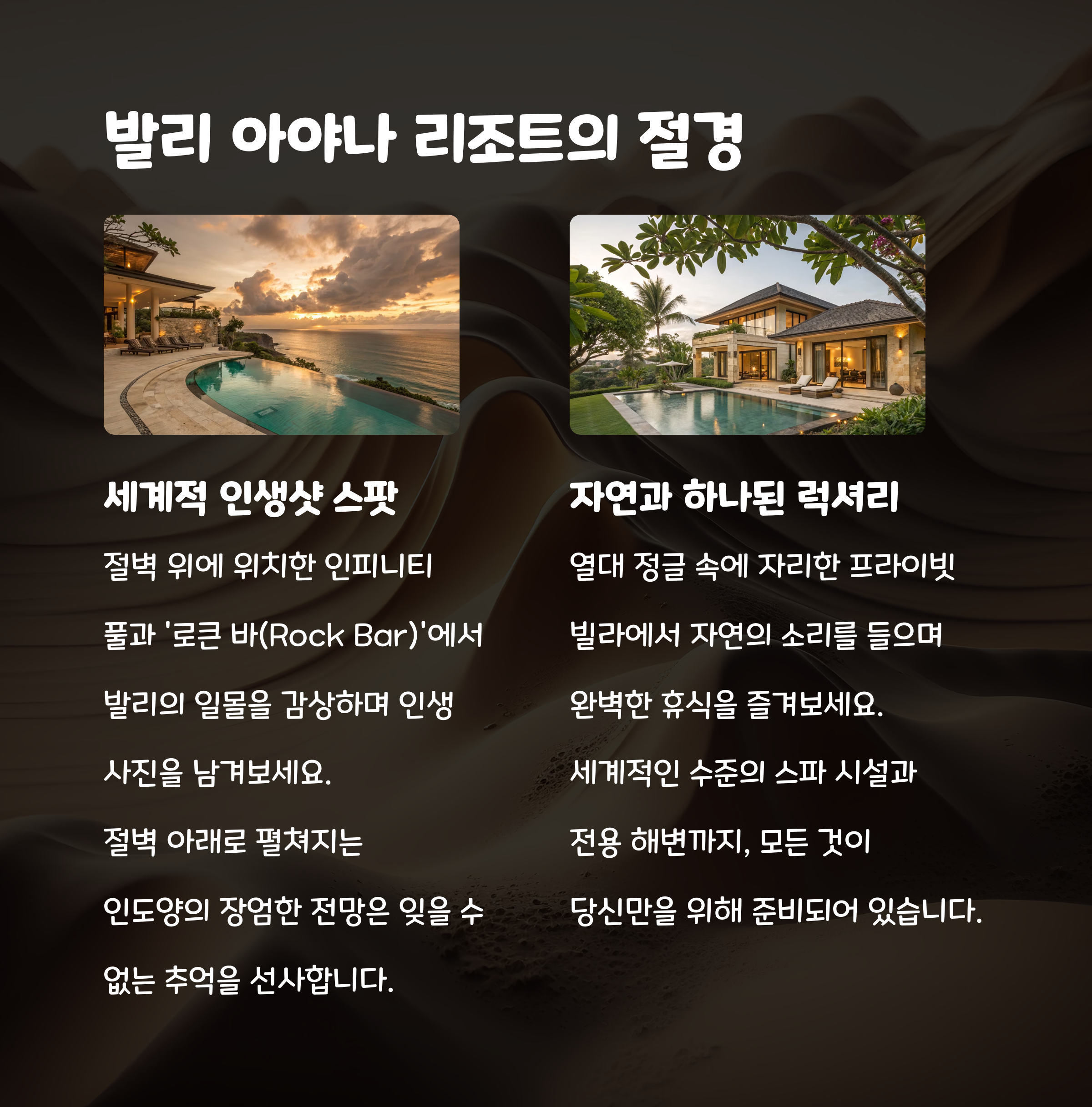 "아야나 리조트는 발리에서 자연과 고급스러움을 모두 누릴 수 있는 대표적인 리조트입니다."
