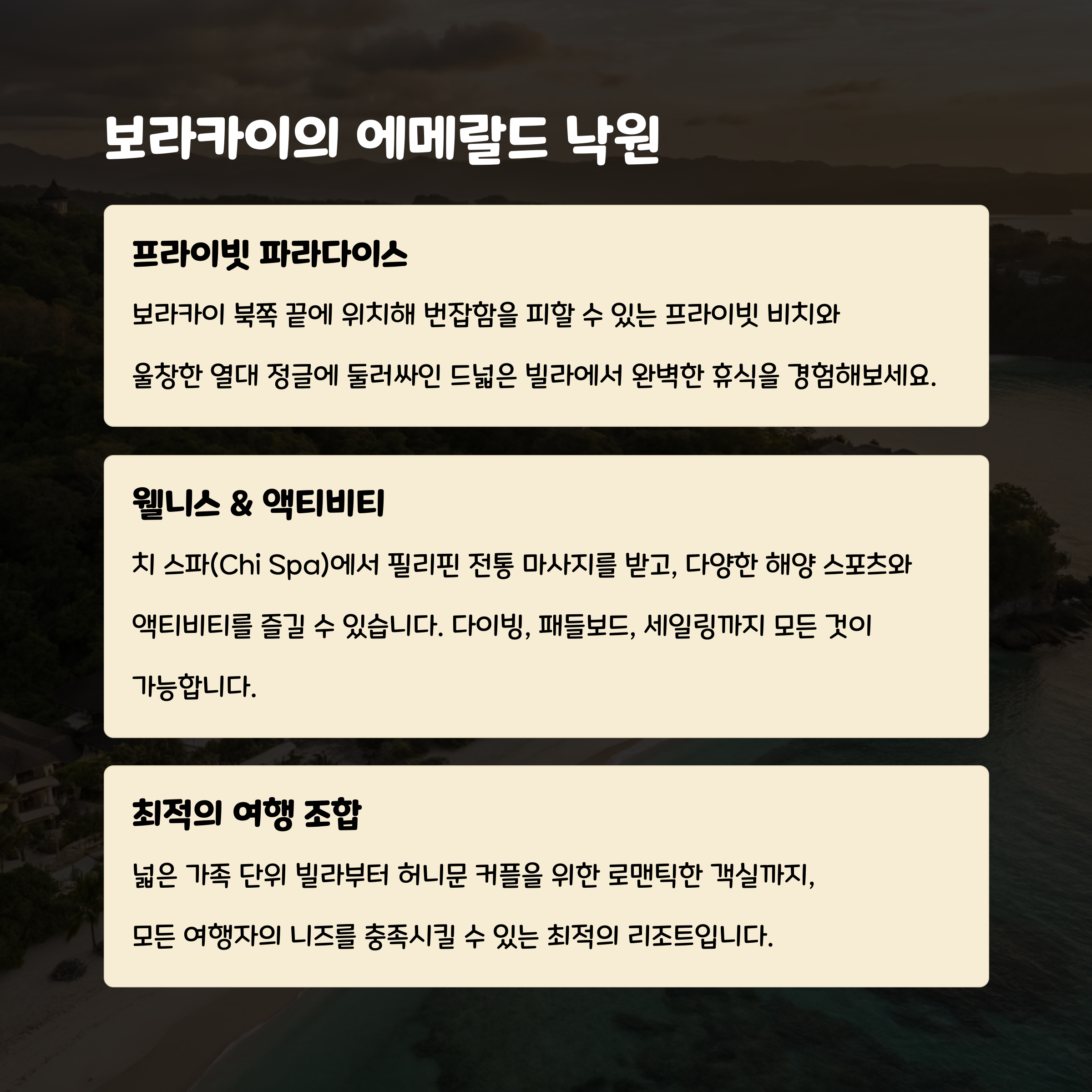 "보라카이 샹그릴라는 프라이빗 비치와 럭셔리함을 동시에 갖춘 리조트입니다."