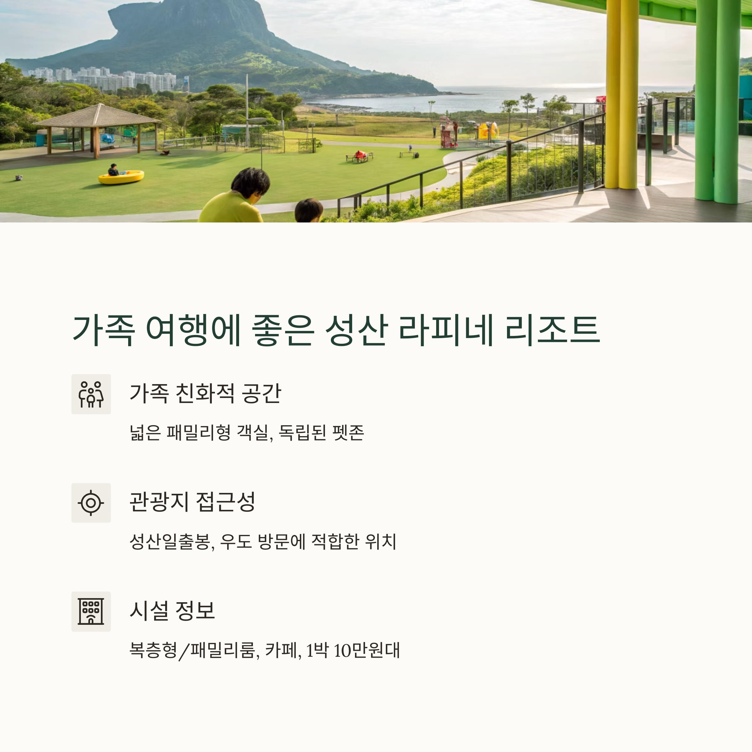 | 라피네 리조트 | 성산 | 10만원대 | 가족형 구조, 펫존 |