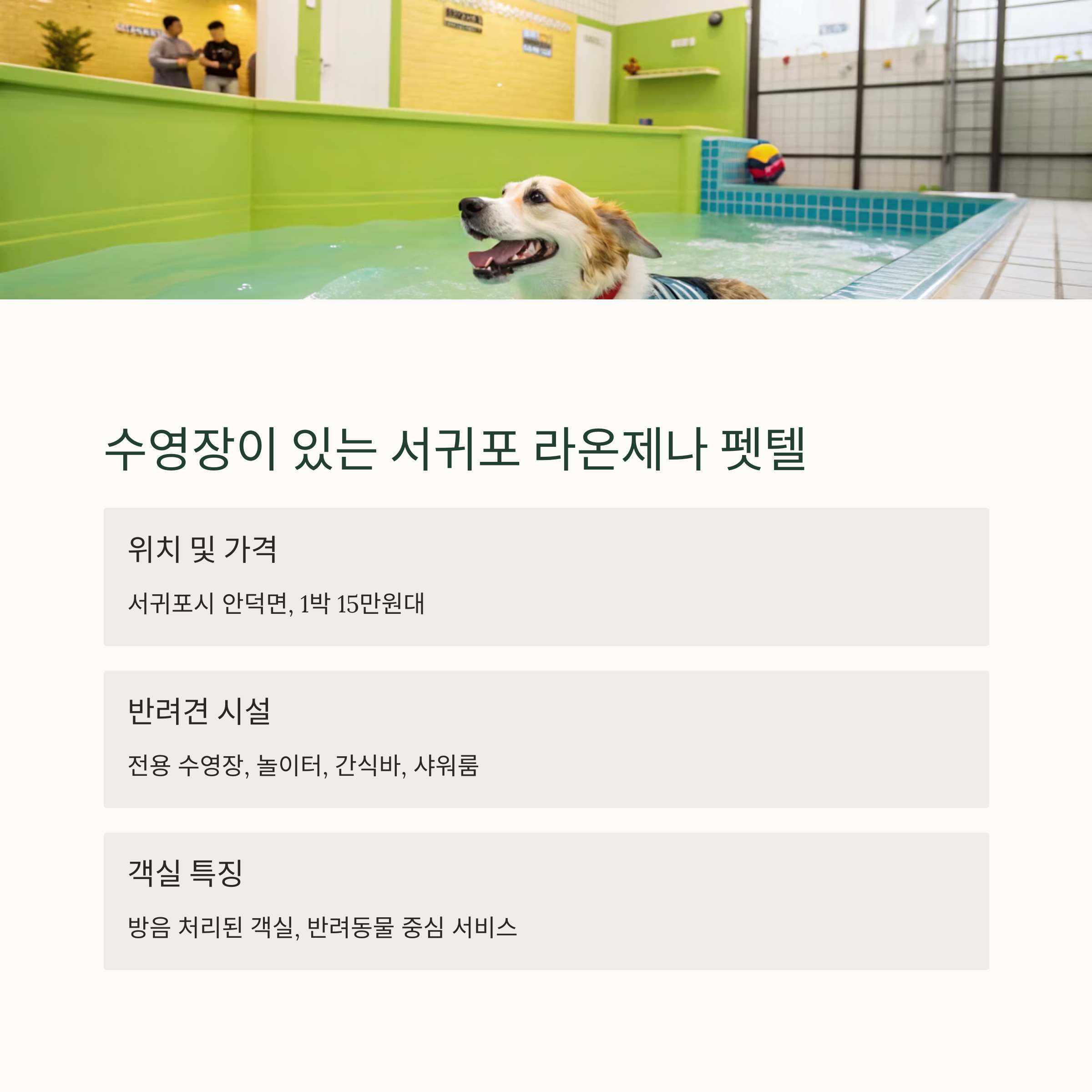| 라온제나 펫텔 | 서귀포 | 15만원대 | 수영장, 반려견 서비스 우수 |