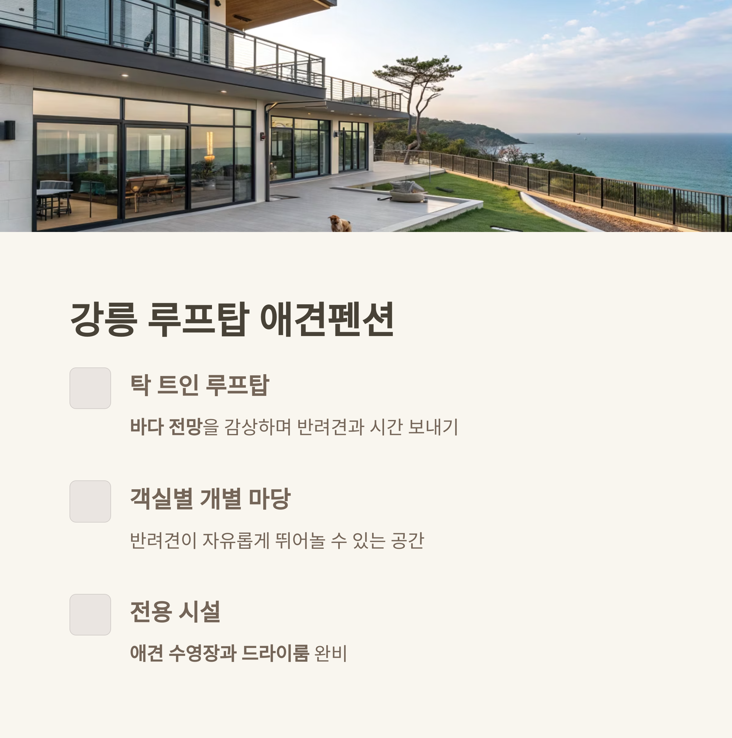 강릉 사천해변 근처에 위치한 이 펜션은 탁 트인 루프탑에서 바다를 감상하며 반려견과 시간을 보낼 수 있는 곳입니다.