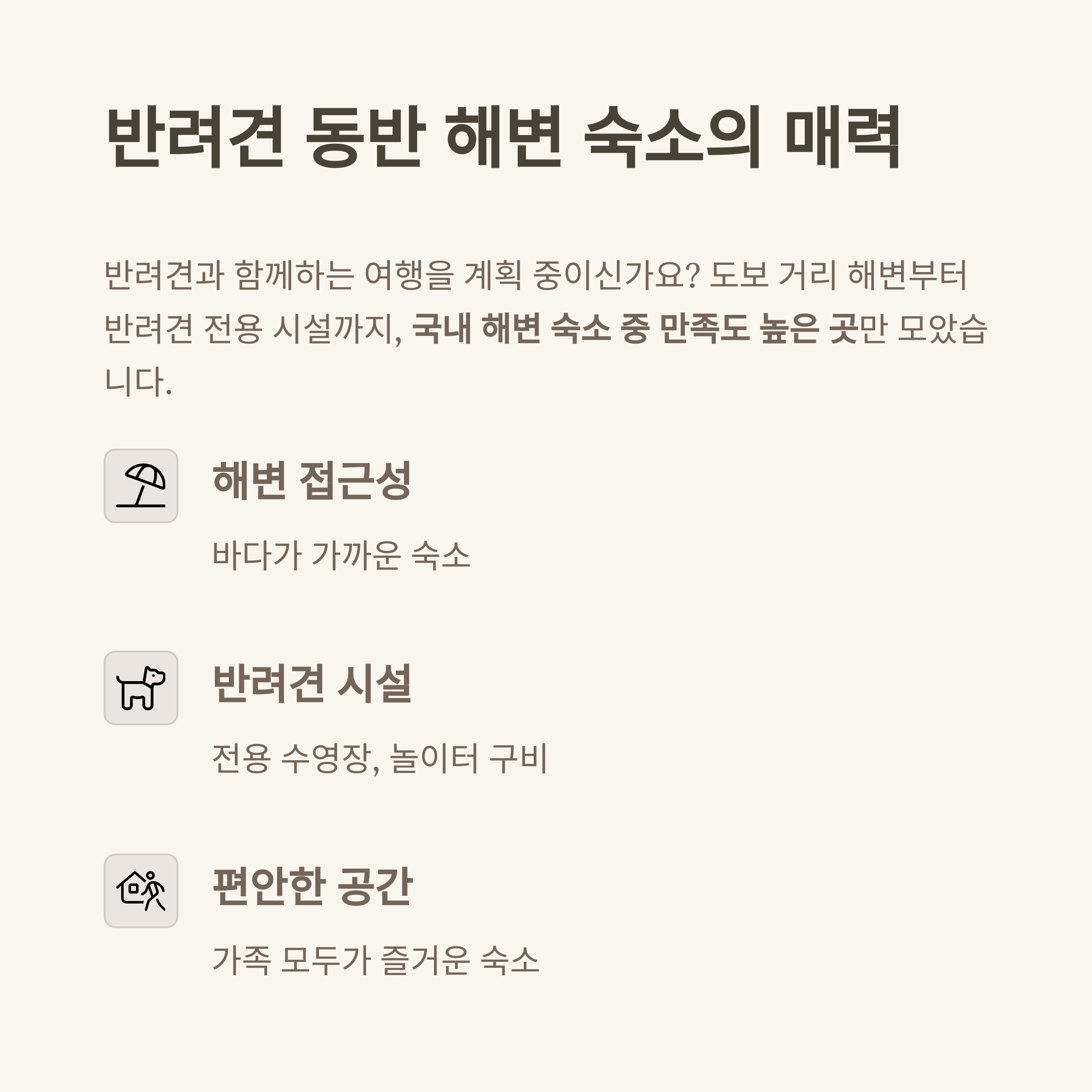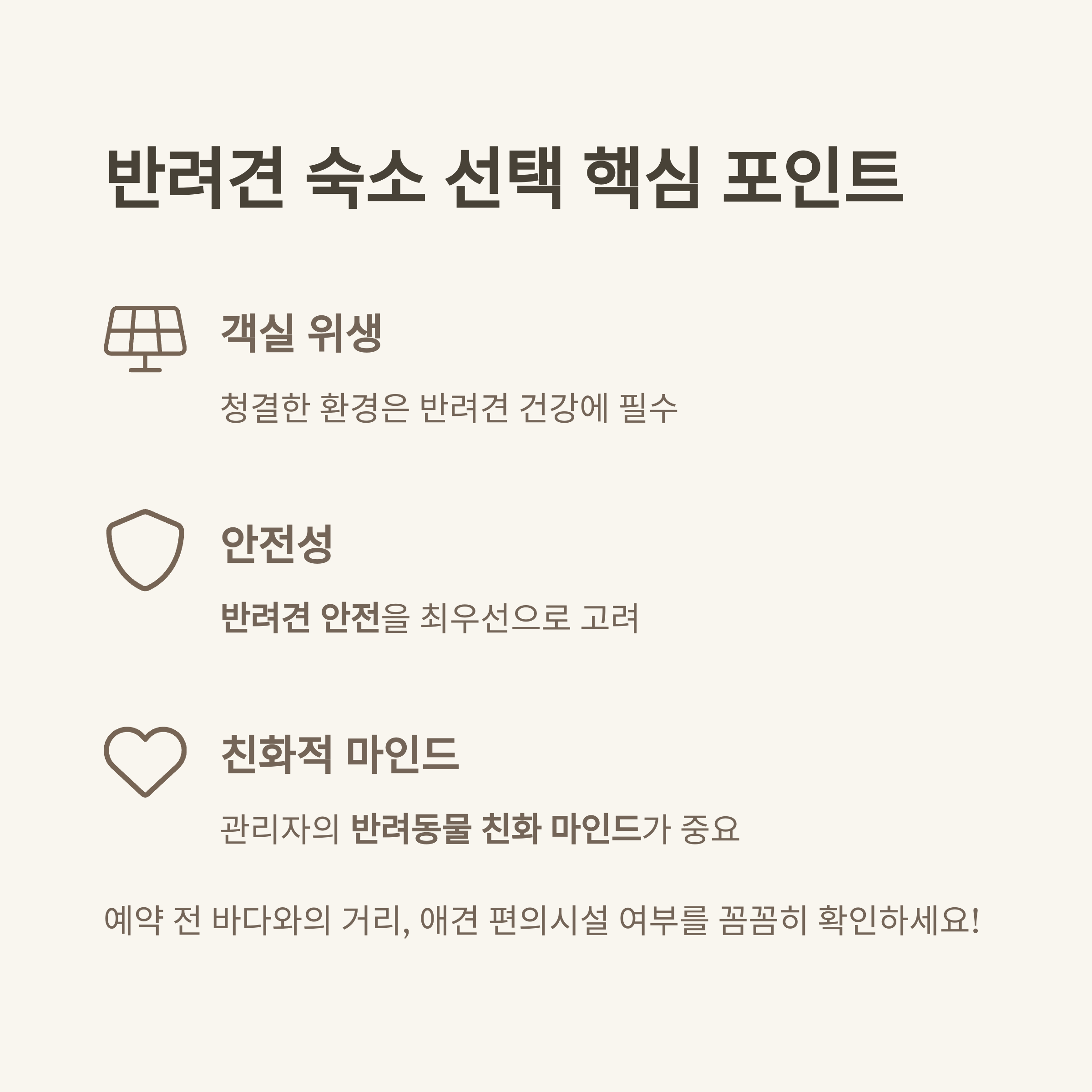특히 바다와의 거리, 애견 편의시설 여부는 예약 전 꼼꼼히 확인해야 할 핵심 사항입니다.
