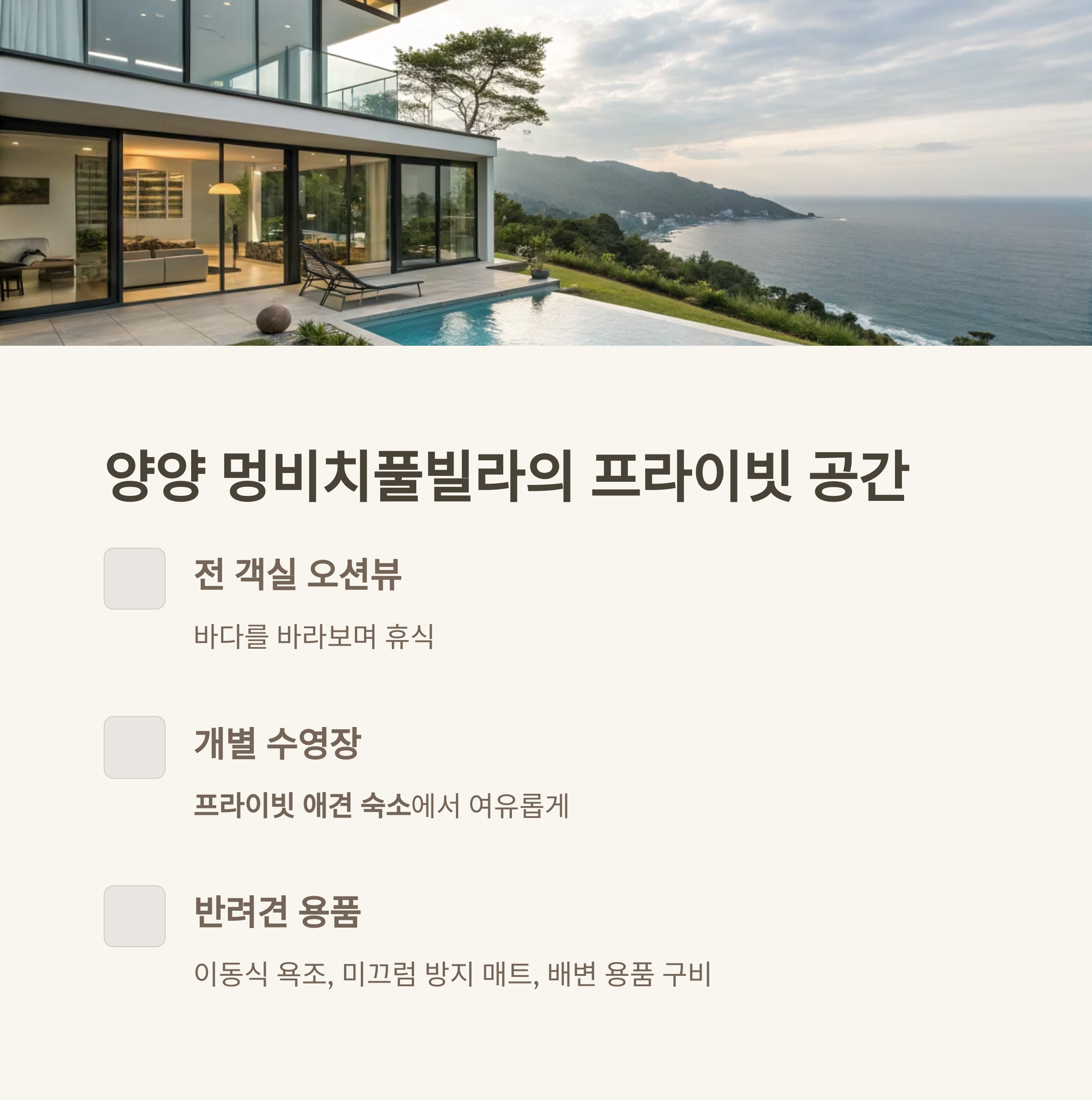 죽도해변 인근에 위치한 ‘멍비치풀빌라’는 전 객실 오션뷰와 개별 수영장이 제공되는 프라이빗 애견 숙소입니다.