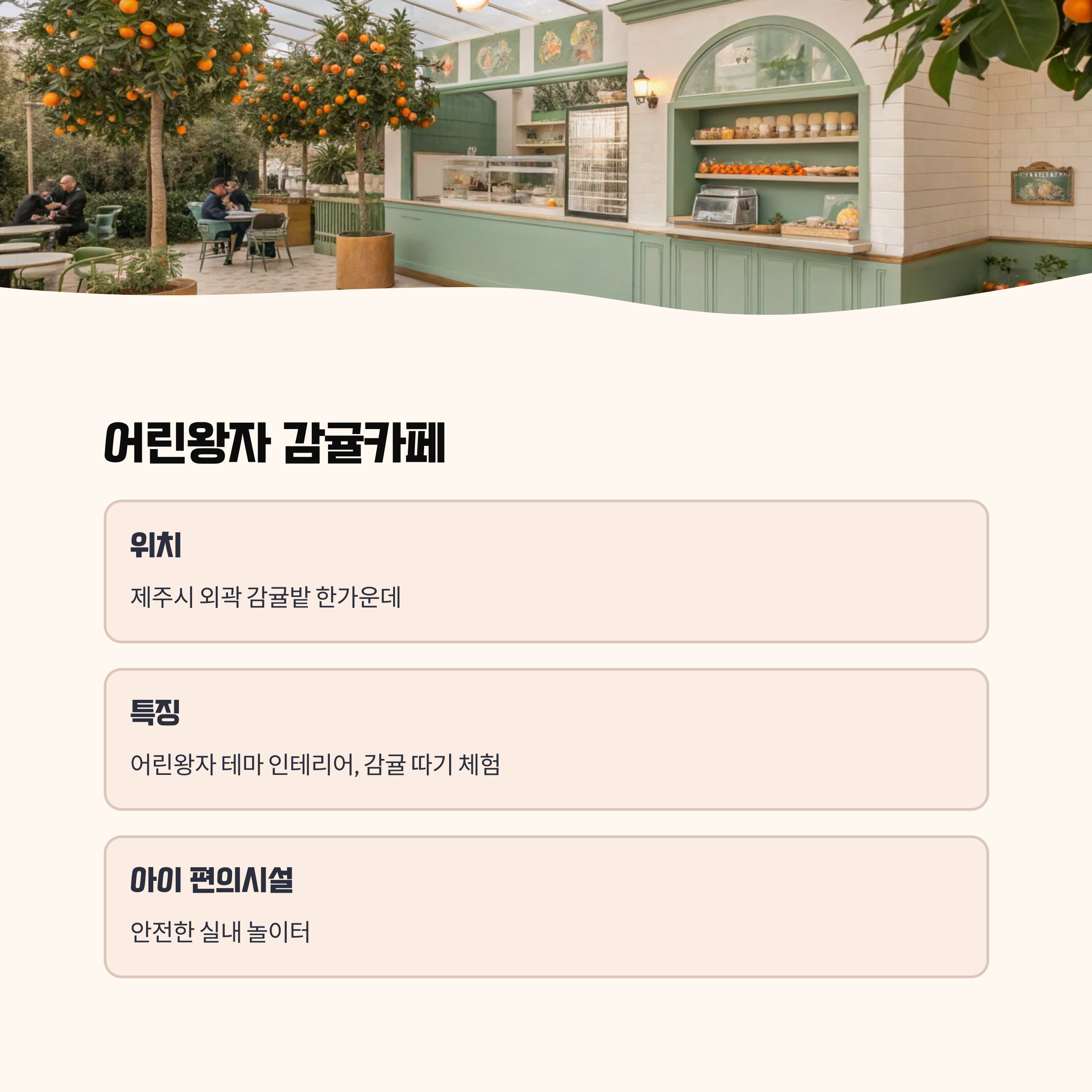 아이들이 감귤을 직접 따볼 수 있는 체험 공간이 있으며, 내부는 어린왕자 테마로 꾸며져 있어