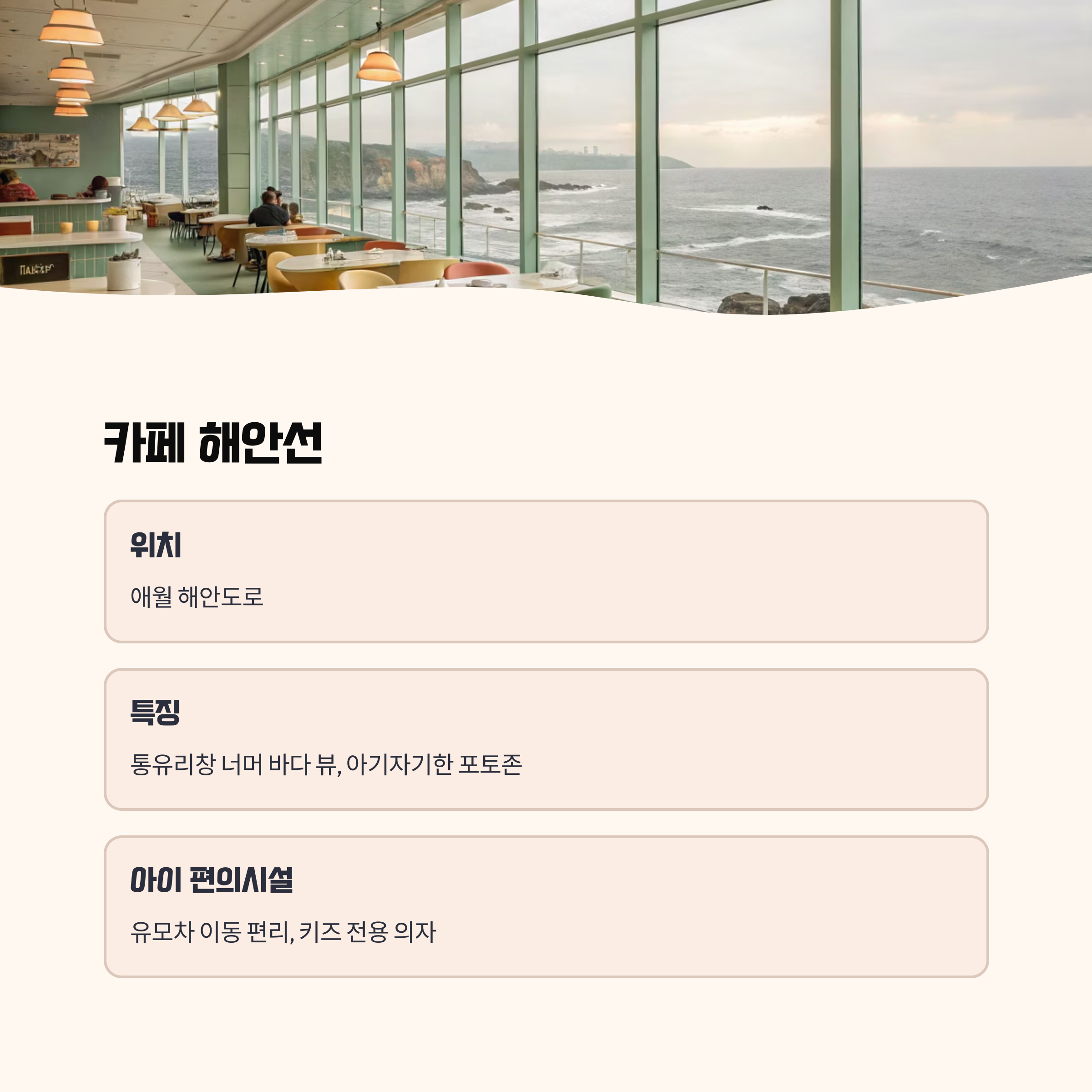 애월 해안도로에 위치한 이 카페는 통유리창 너머로 펼쳐지는 바다 뷰가 압권입니다.