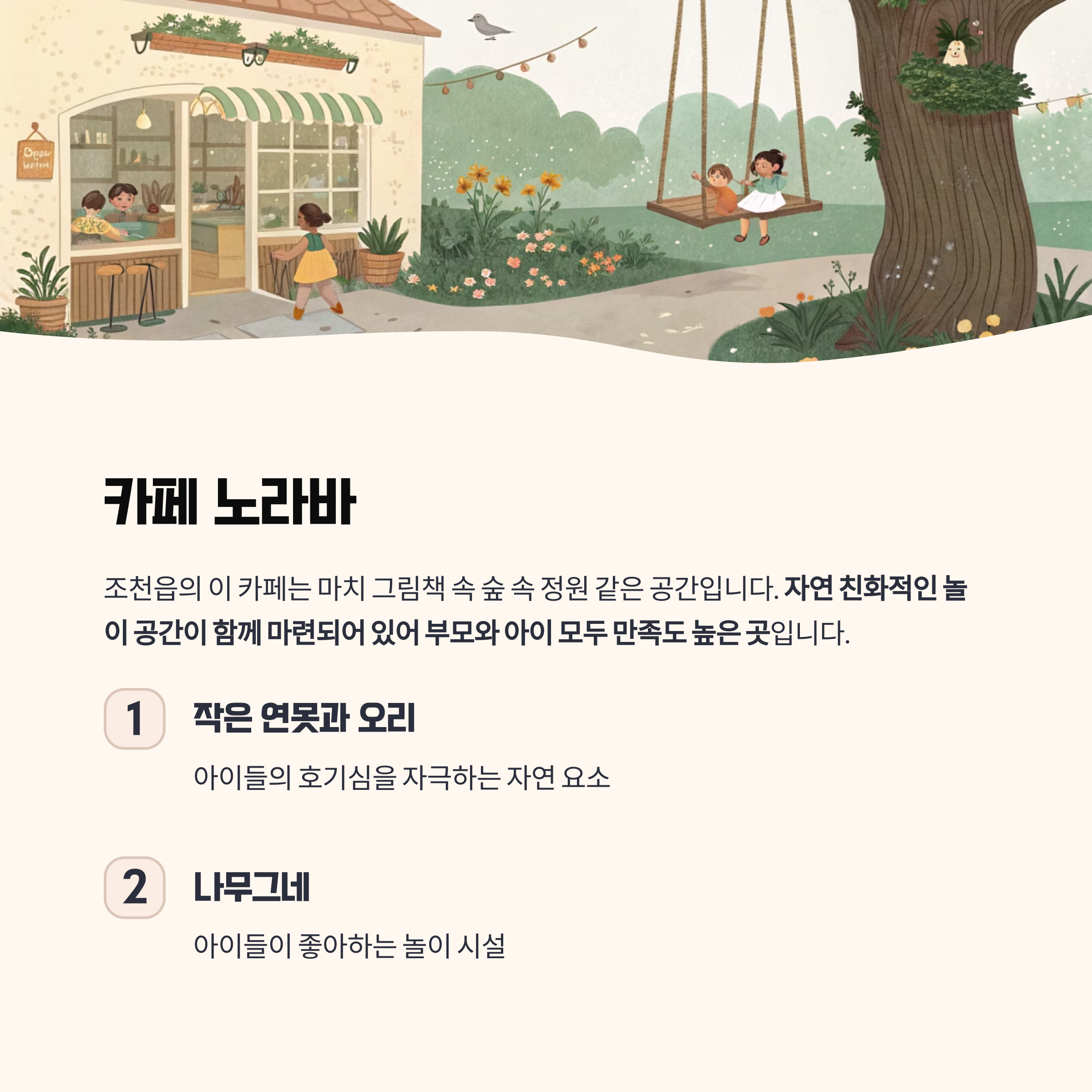 자연 친화적인 놀이 공간이 함께 마련되어 있어 부모와 아이 모두 만족도 높은 곳입니다.