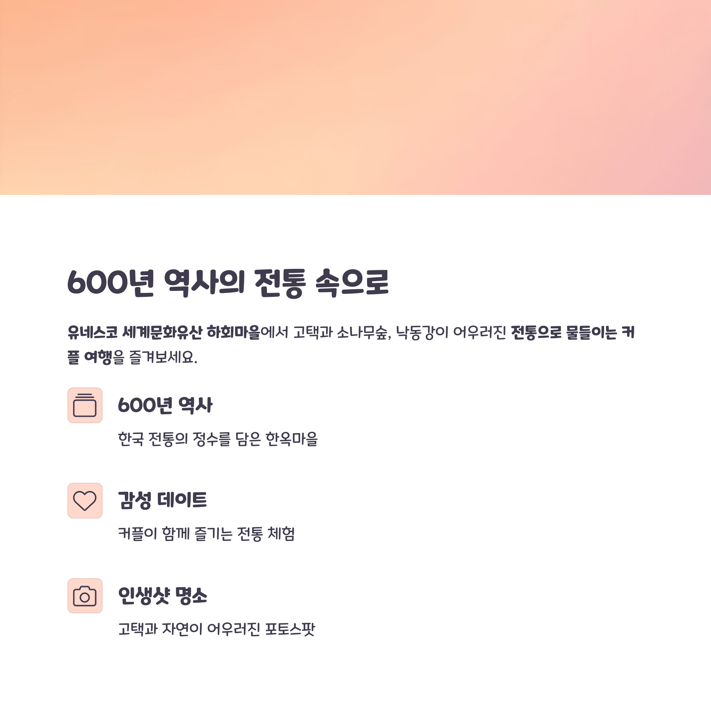 600년 역사를 품은 고택과 소나무숲, 낙동강이 어우러져 커플이 감성 가득한 데이트를 즐기기에 완벽한 장소입니다.