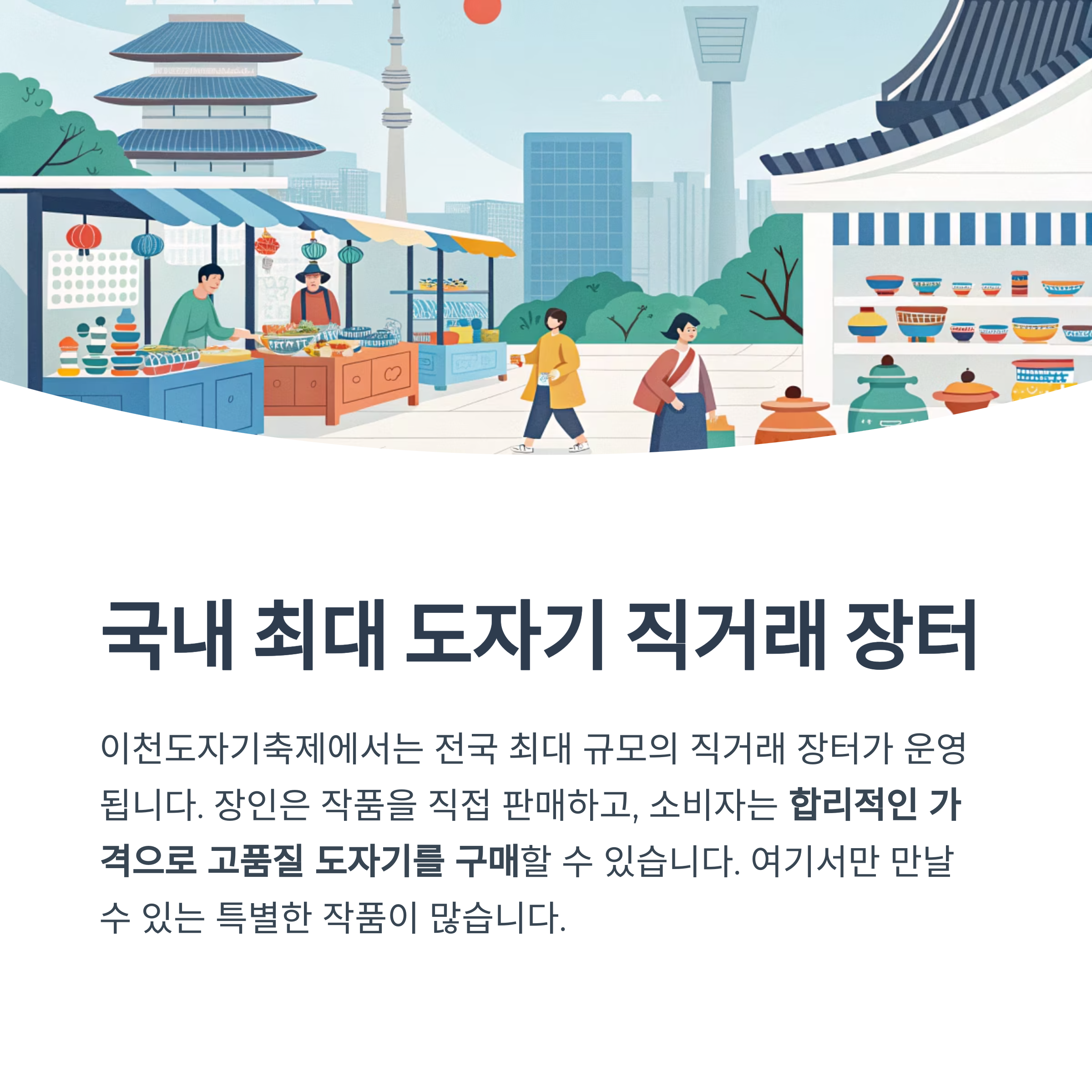 이천도자기축제에서는 전국 최대 규모의 직거래 장터가 운영됩니다.