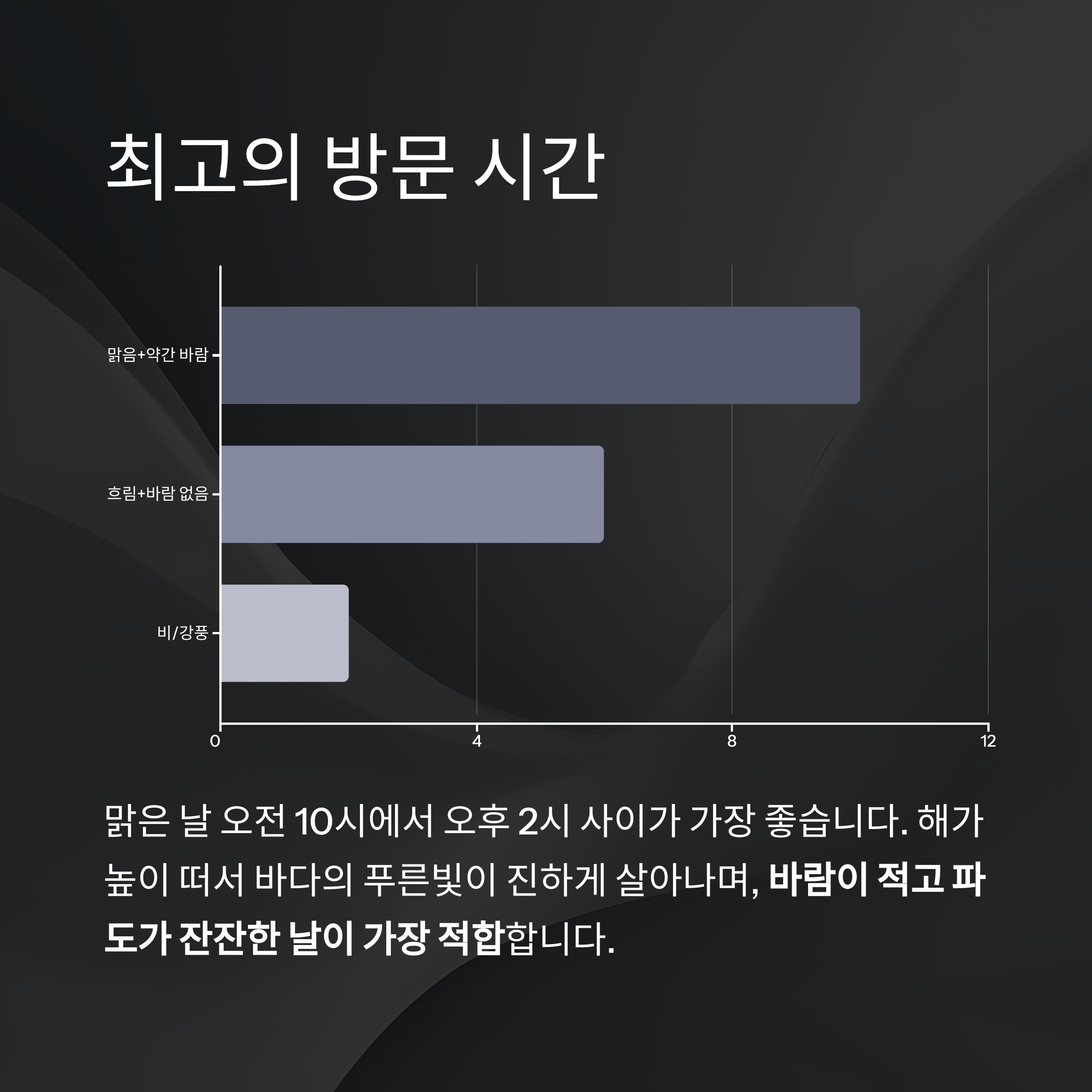 맑은 날 오전 10시에서 오후 2시 사이가 가장 좋습니다.