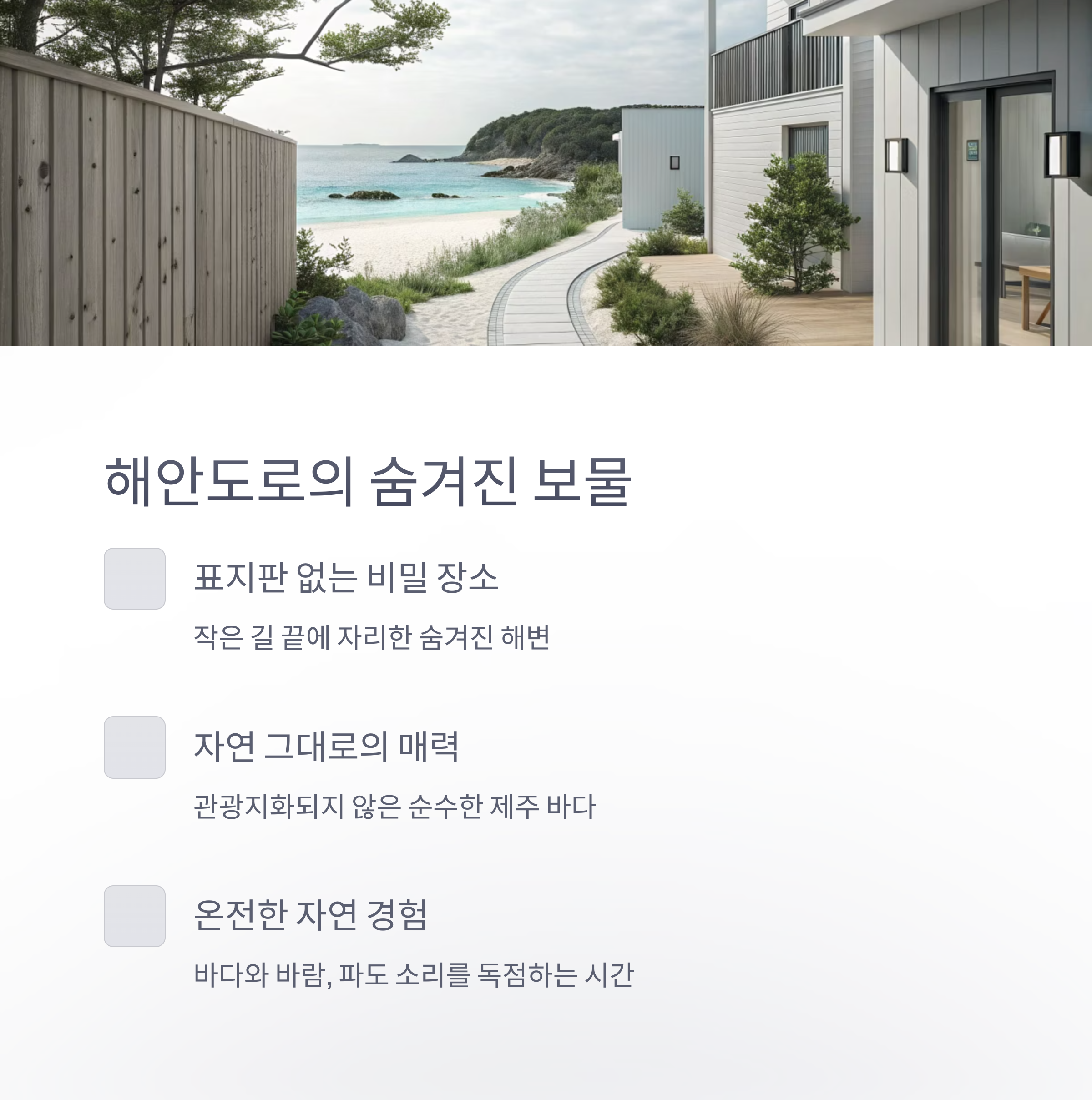 관광지화되지 않아 자연 그대로의 바다와 바람, 파도 소리를 온전히 느낄 수 있는 점이 가장 큰 매력입니다.