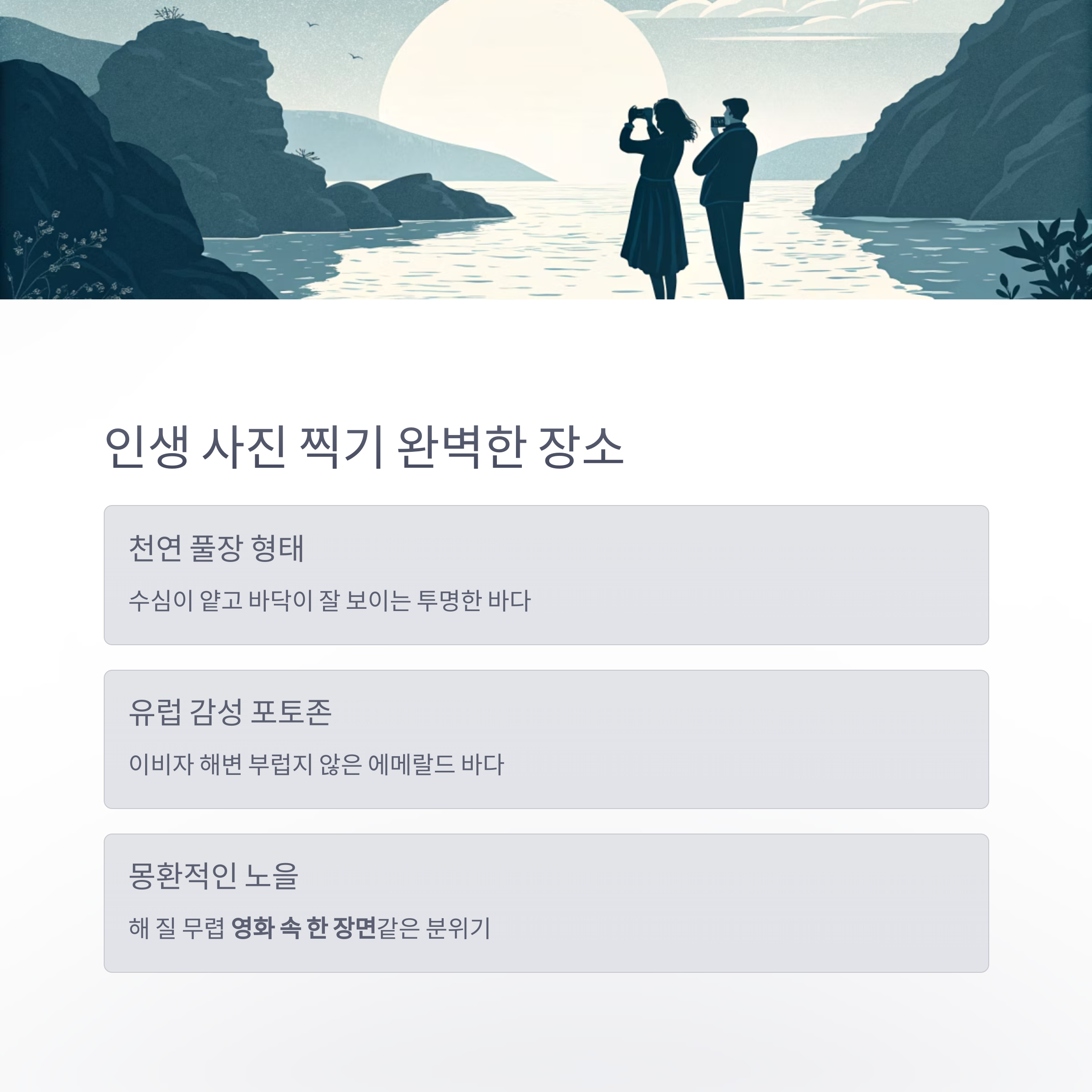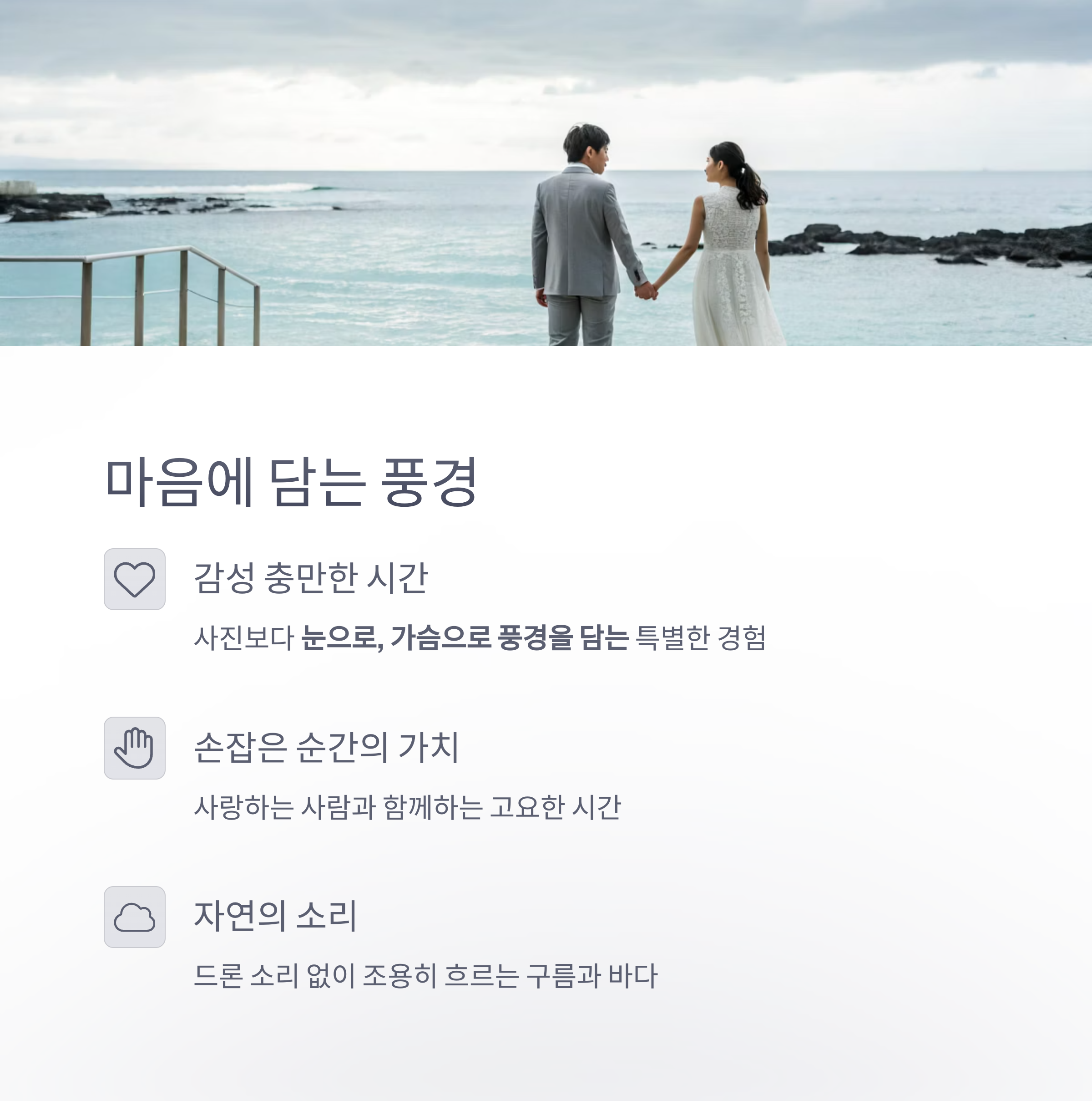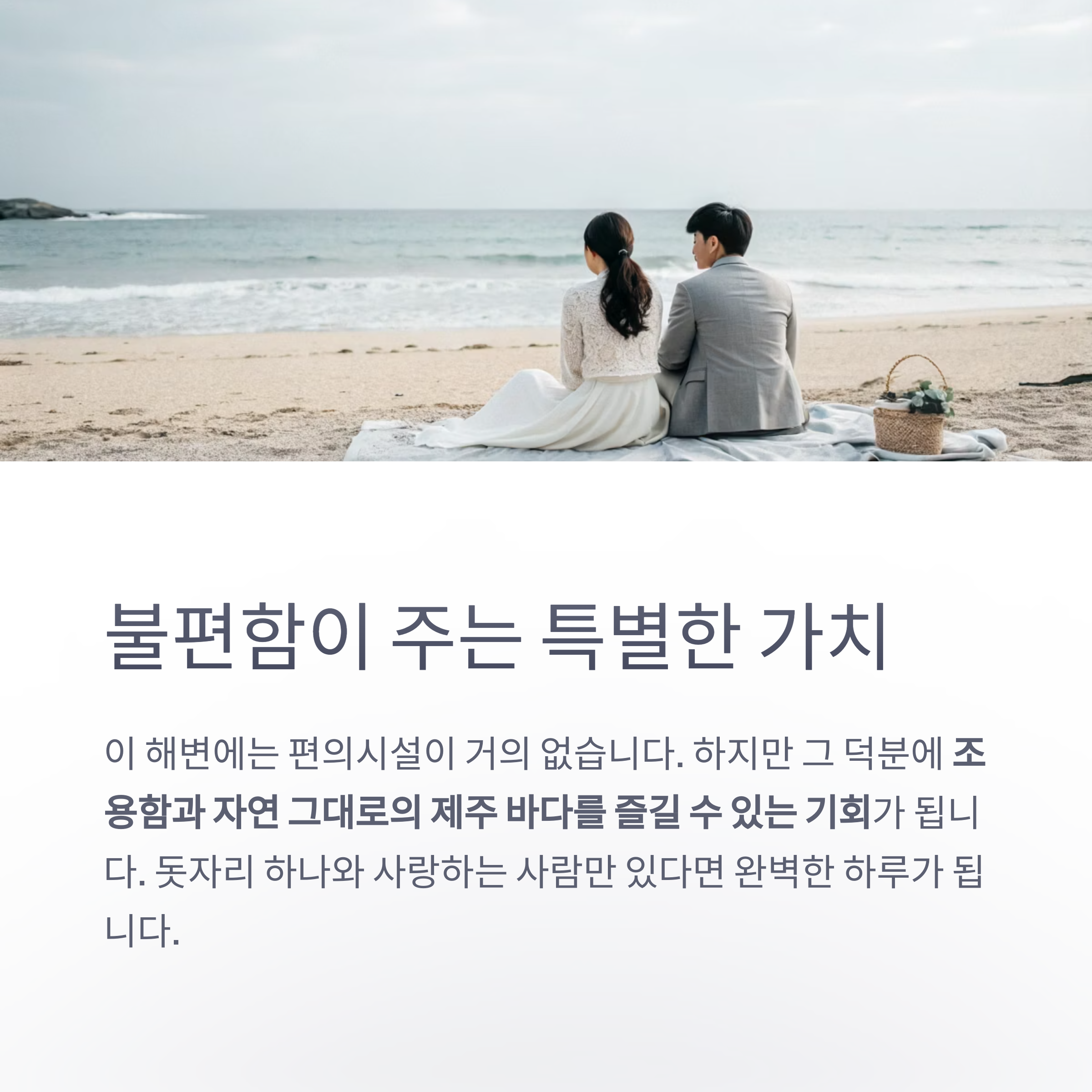 단 한 사람과 조용한 파도 소리를 들으며 보내는 시간은 평생 잊지 못할 기억이 됩니다.