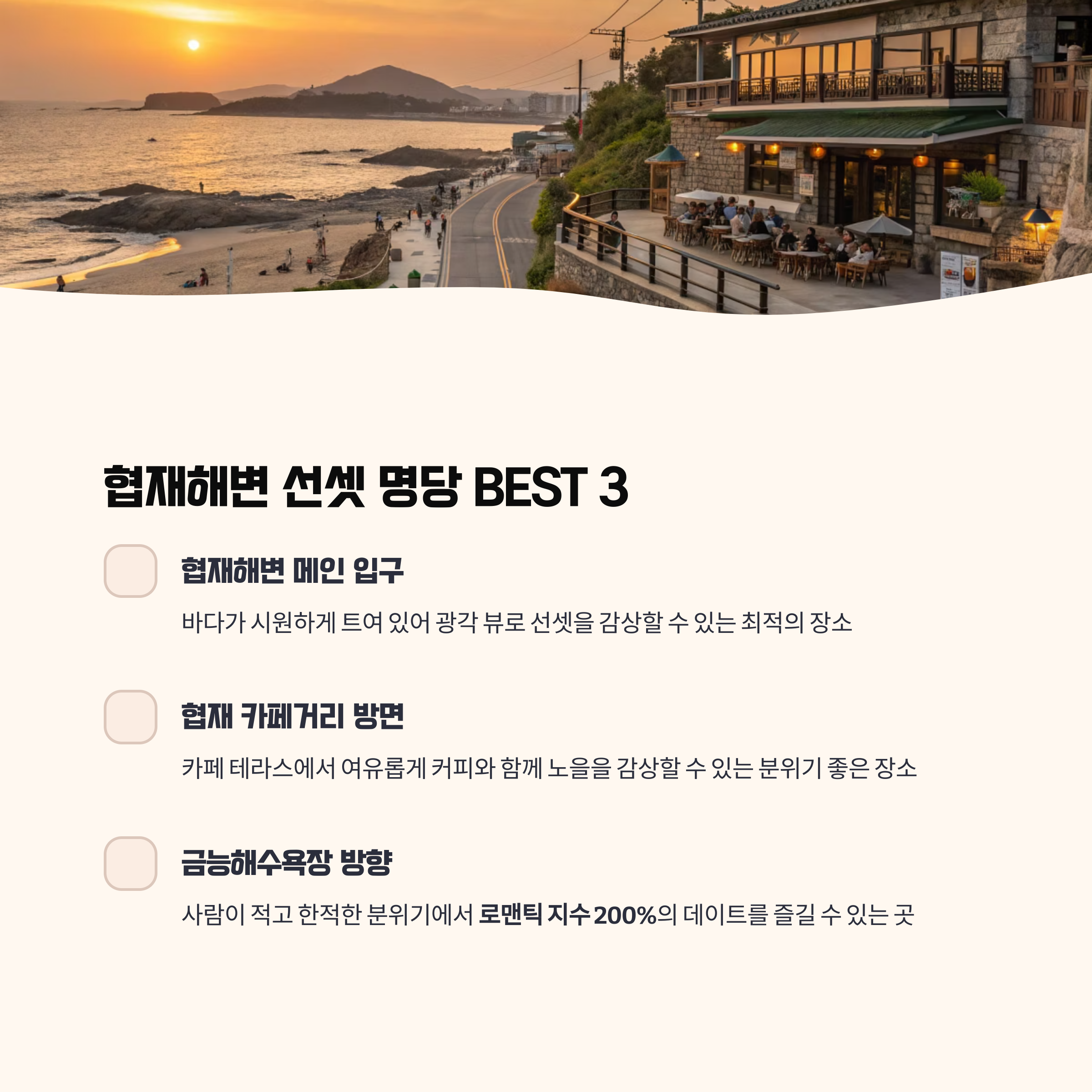 - 협재 카페거리 방면 : 카페 테라스와 함께 여유로운 감상 가능