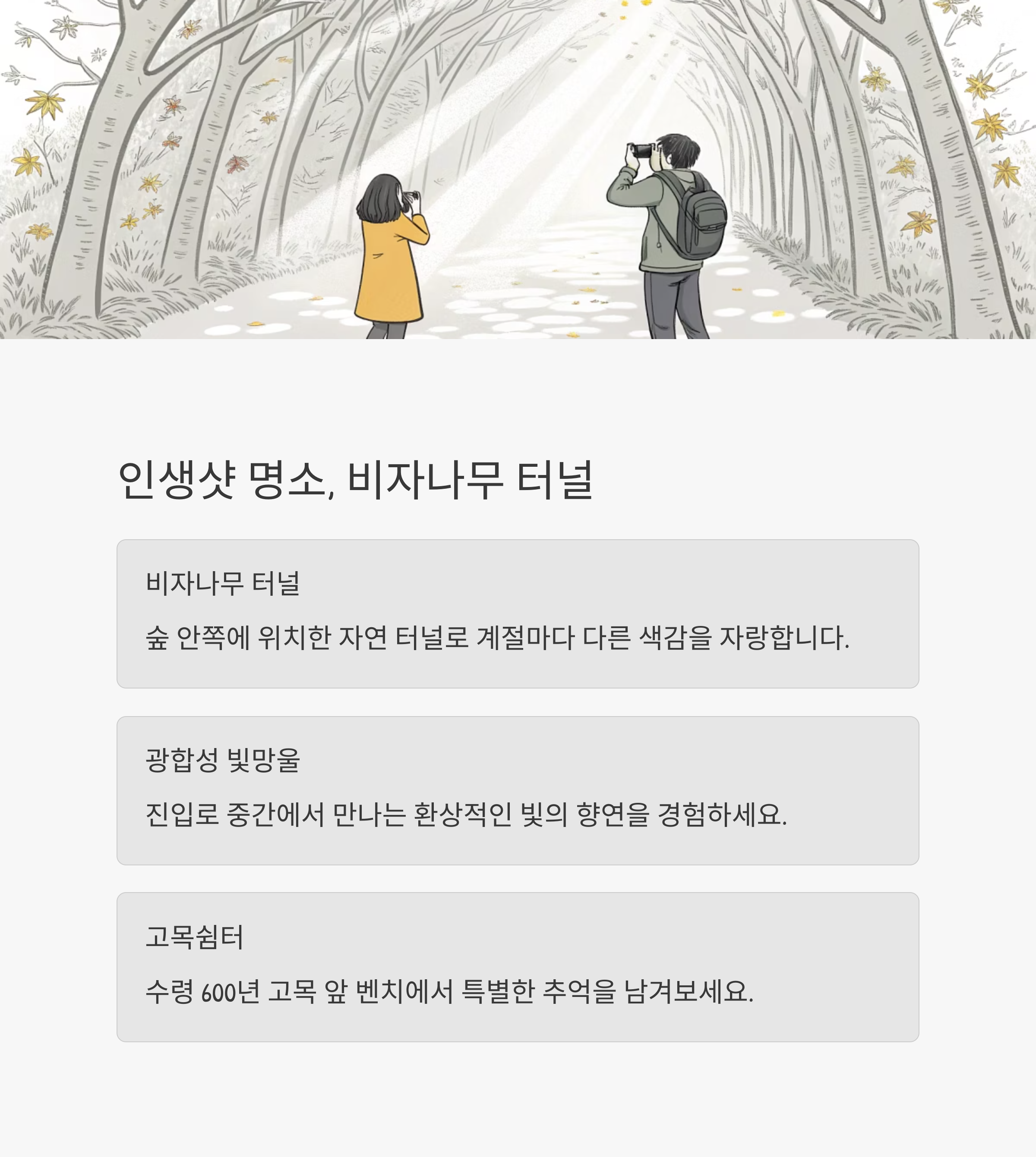 시원한 그늘과 청량한 공기가 가득한 이곳은 사랑하는 사람과의 대화, 사색, 사진 모두에 최적의 장소입니다.