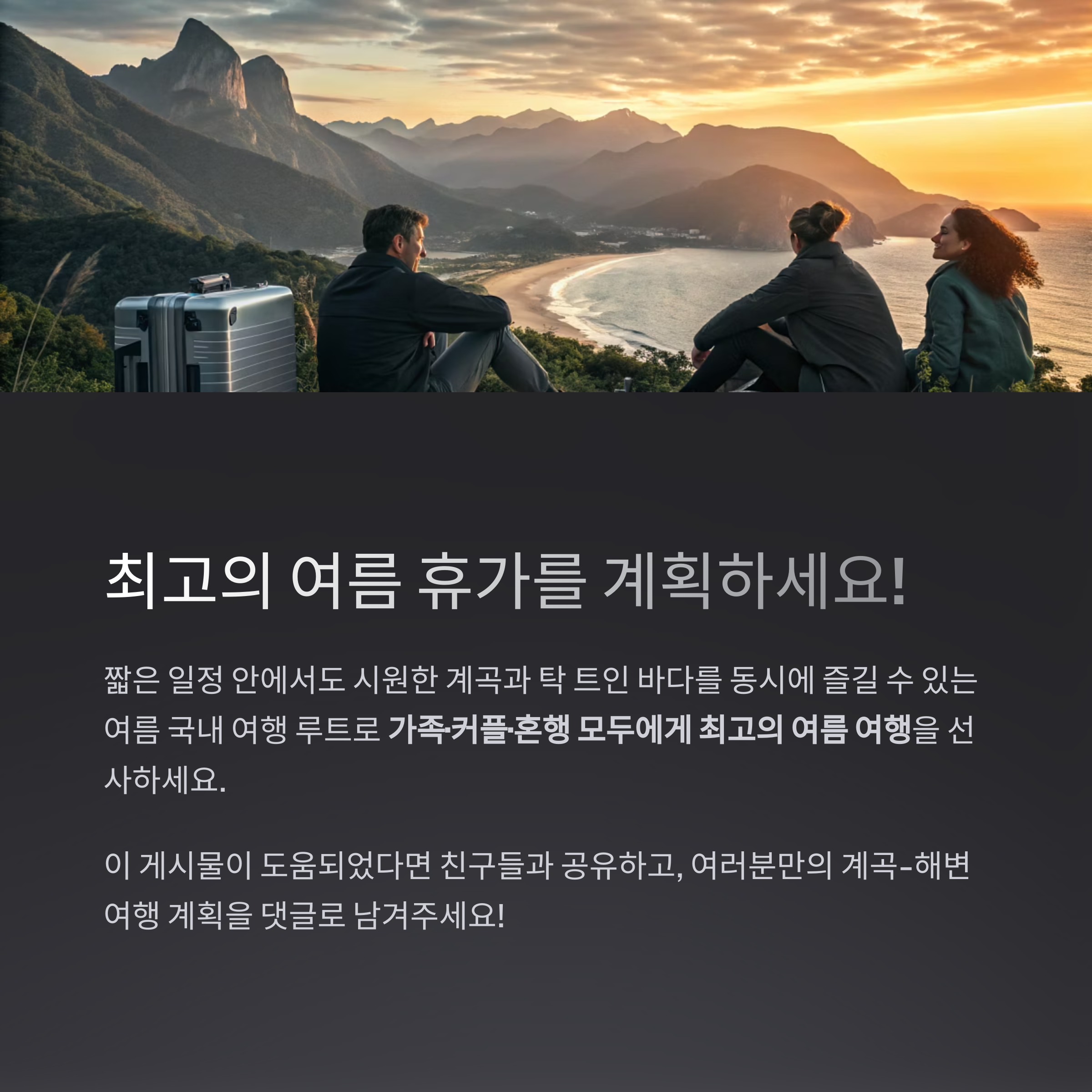 짧은 일정 안에서도 시원한 계곡과 탁 트인 바다를 동시에 즐길 수 있는 여름 국내 여행 루트는 충분히 가능합니다.