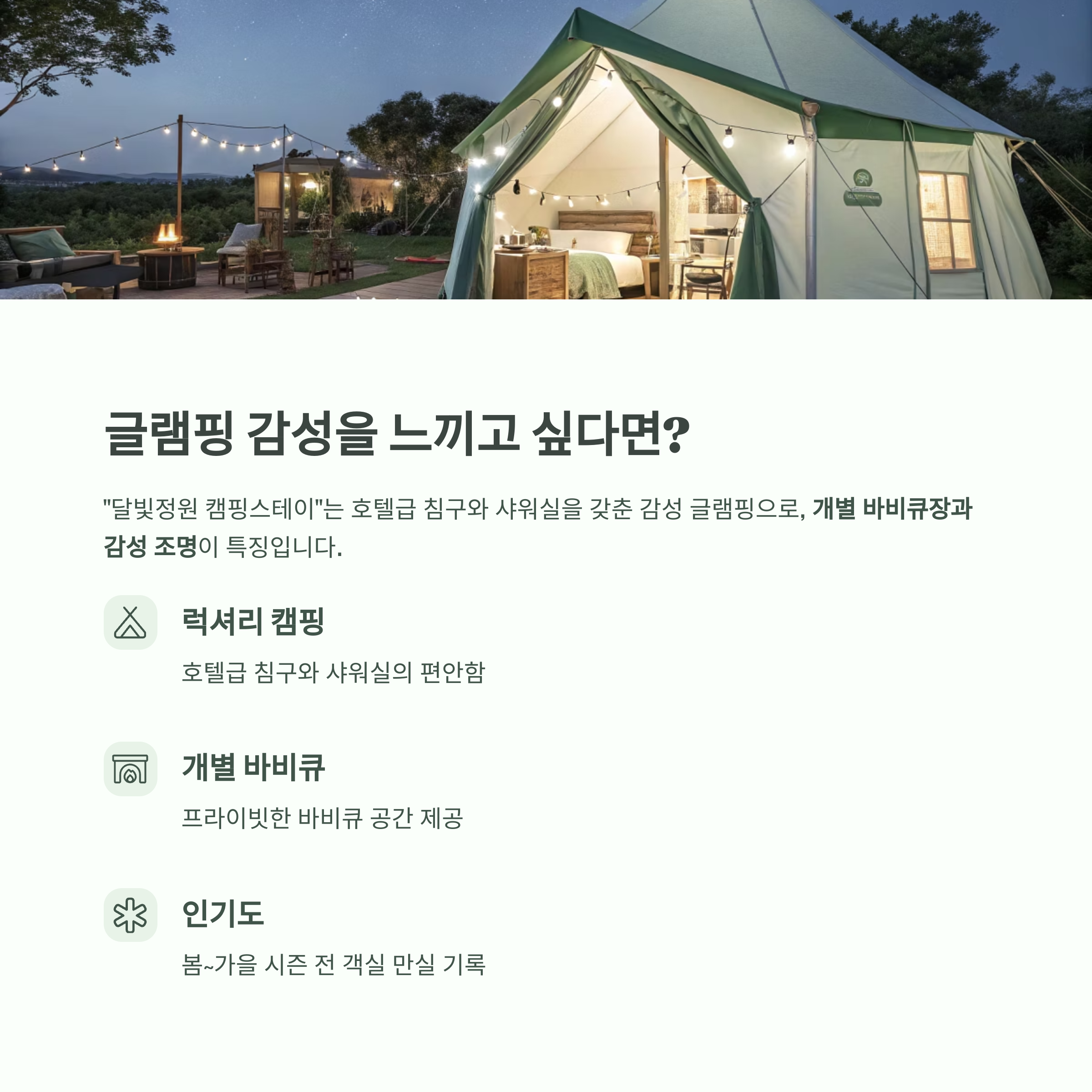실내는 호텔급 침구와 샤워실, 외부는 개별 바비큐장과 감성 조명으로 꾸며져 있습니다.