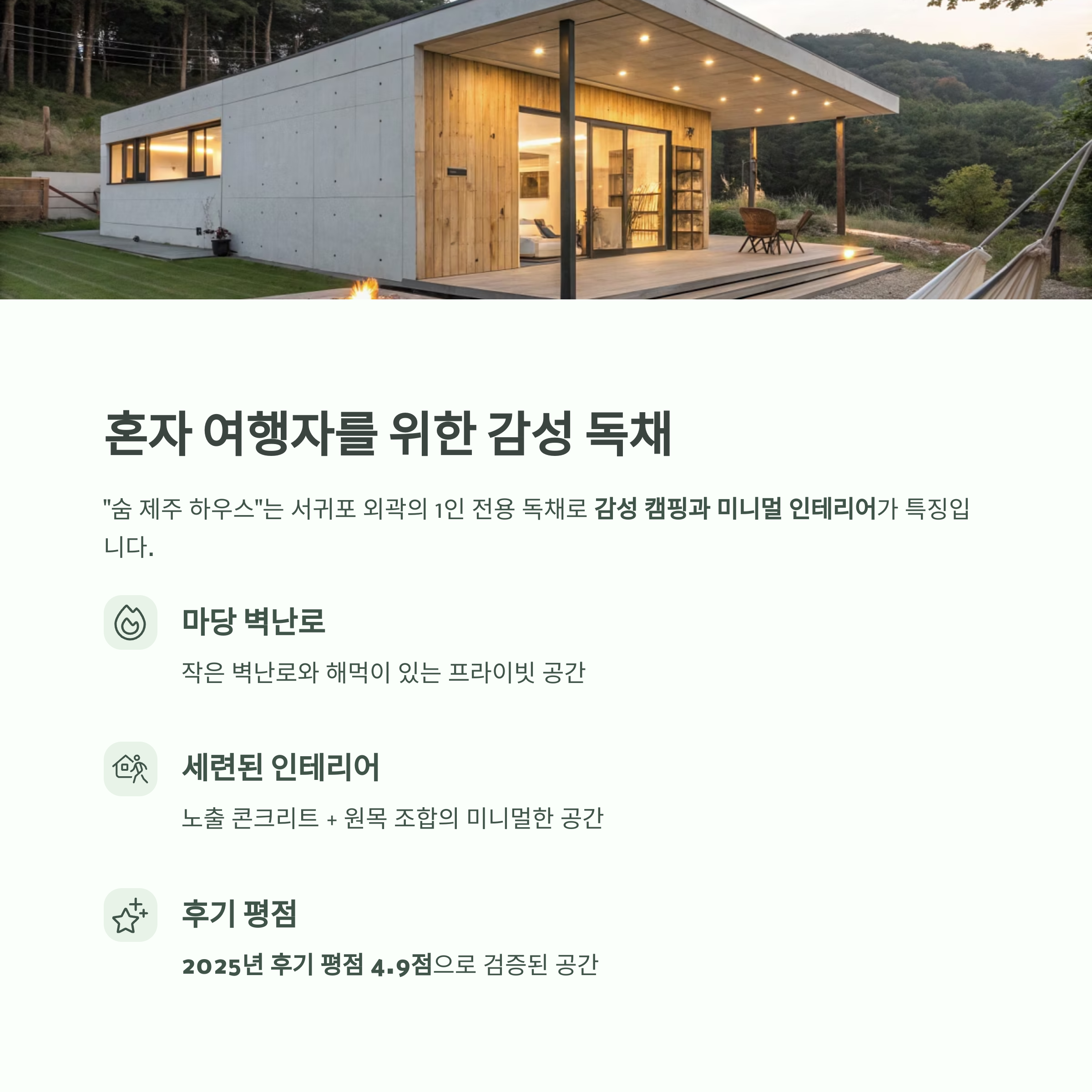 | 숨 제주 하우스 | 서귀포 | 혼자 여행 | 4.9점 |