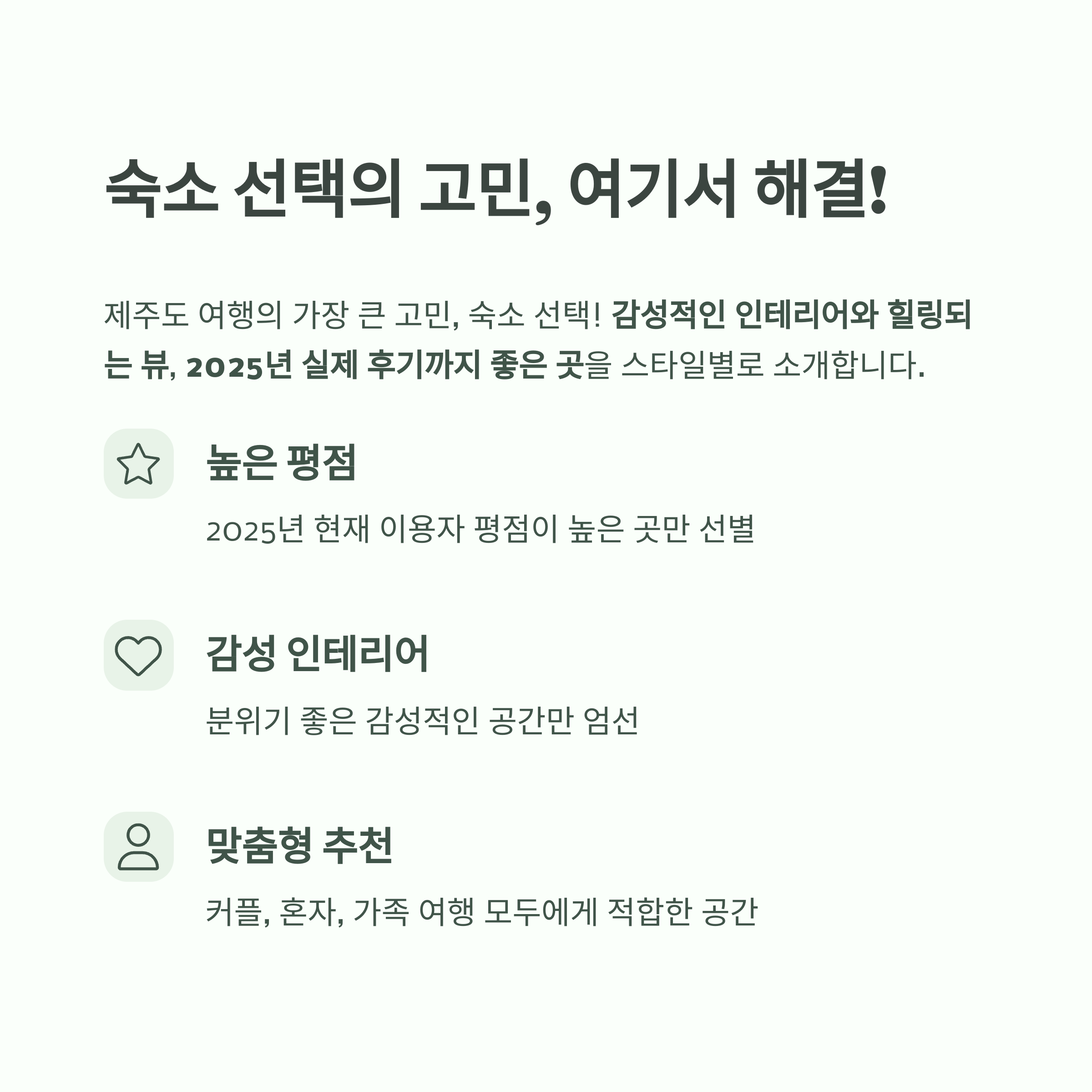 이 글에서는 2025년 현재 이용자 평점이 높고, 감성적인 분위기를 자랑하는 제주 숙소 7곳을 스타일별로 소개합니다.