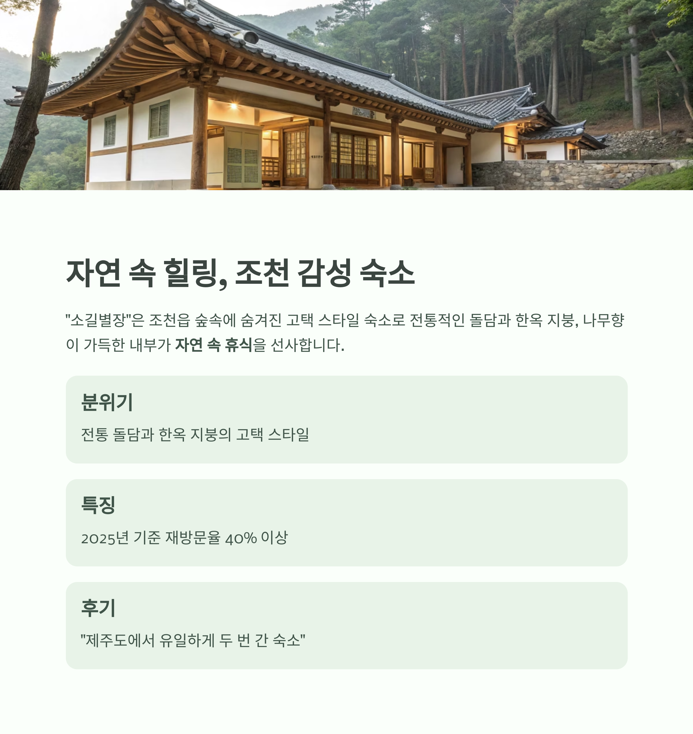 전통적인 돌담과 한옥 지붕, 나무향이 가득한 내부가 자연 속 휴식을 강조합니다.