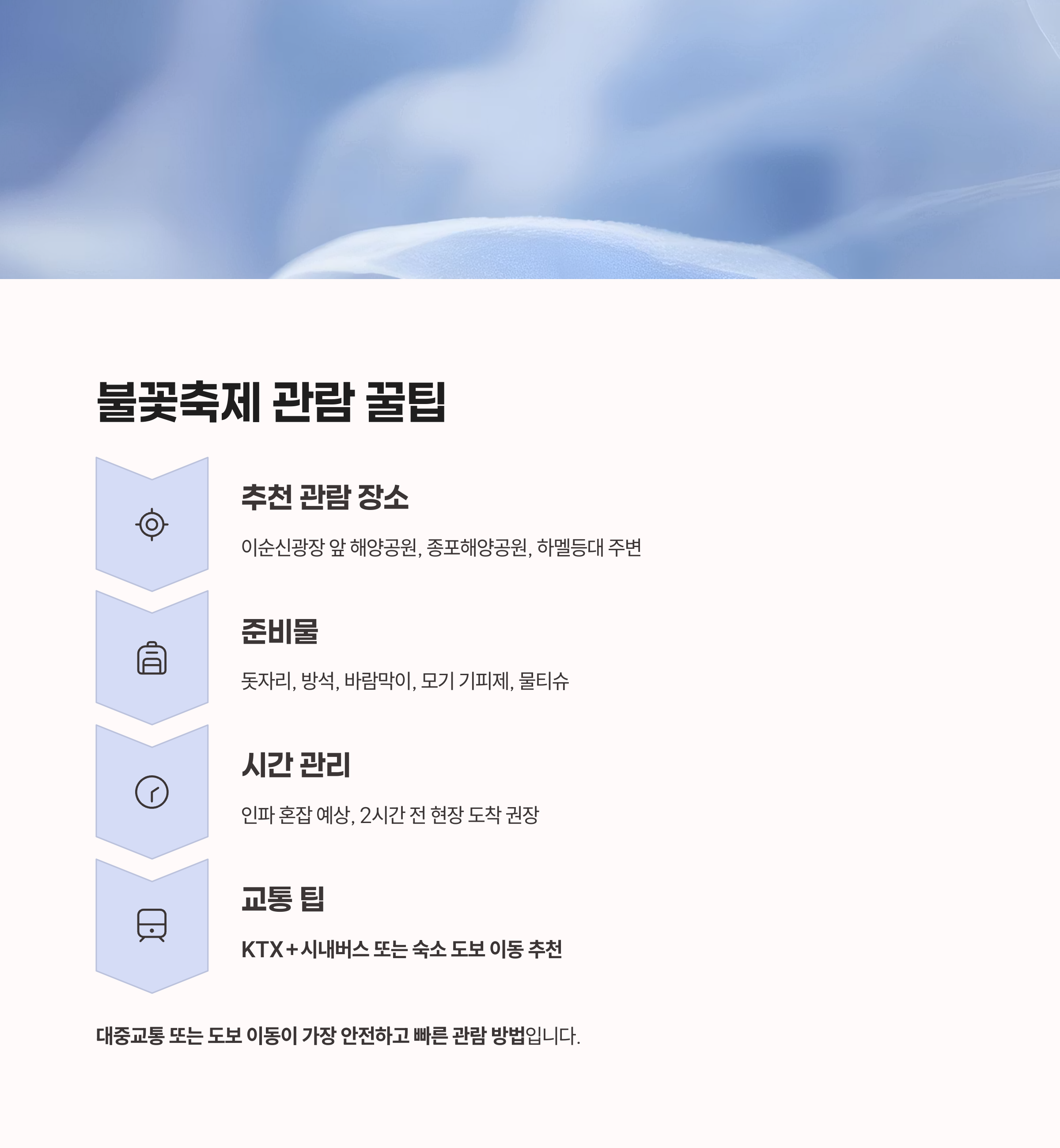 | 추천 관람 장소 | 이순신광장 앞 해양공원, 종포해양공원, 하멜등대 주변 |