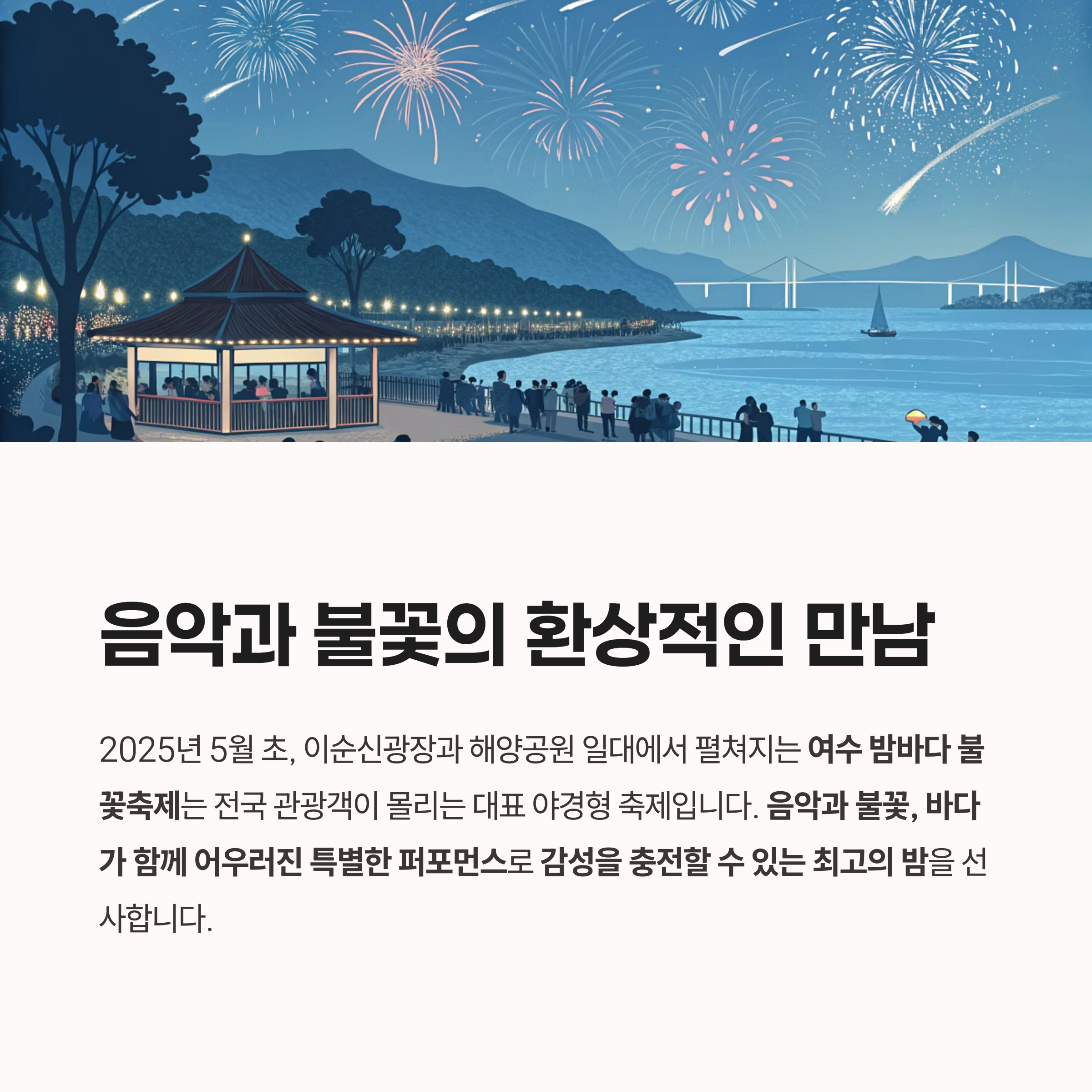 여수의 바다, 역사, 음악, 지역 문화가 하나로 어우러지는 대표 도시형 야경축제입니다.