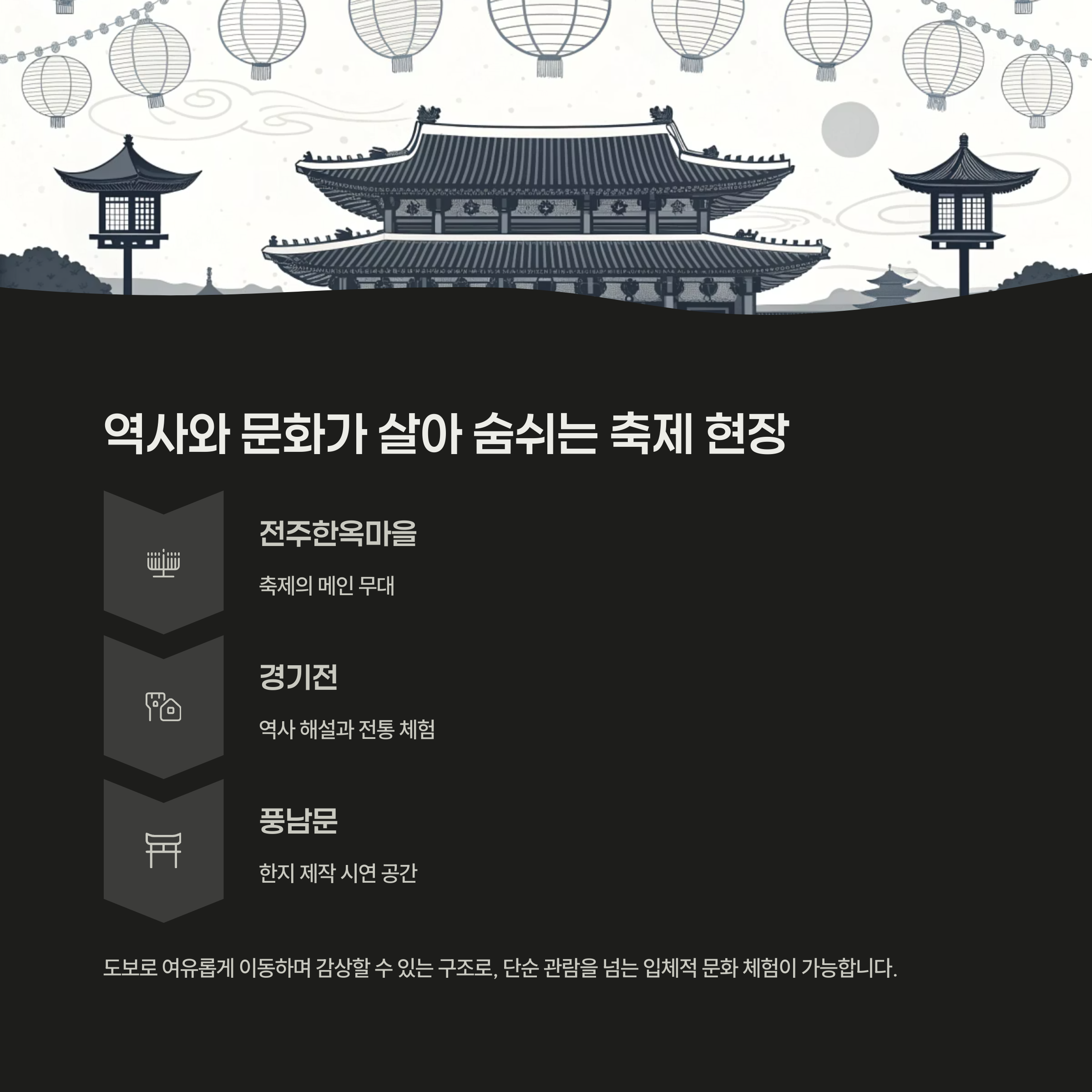 축제는 전주한옥마을, 경기전, 풍남문 등 문화유산 공간 전체에서 분산 운영되며