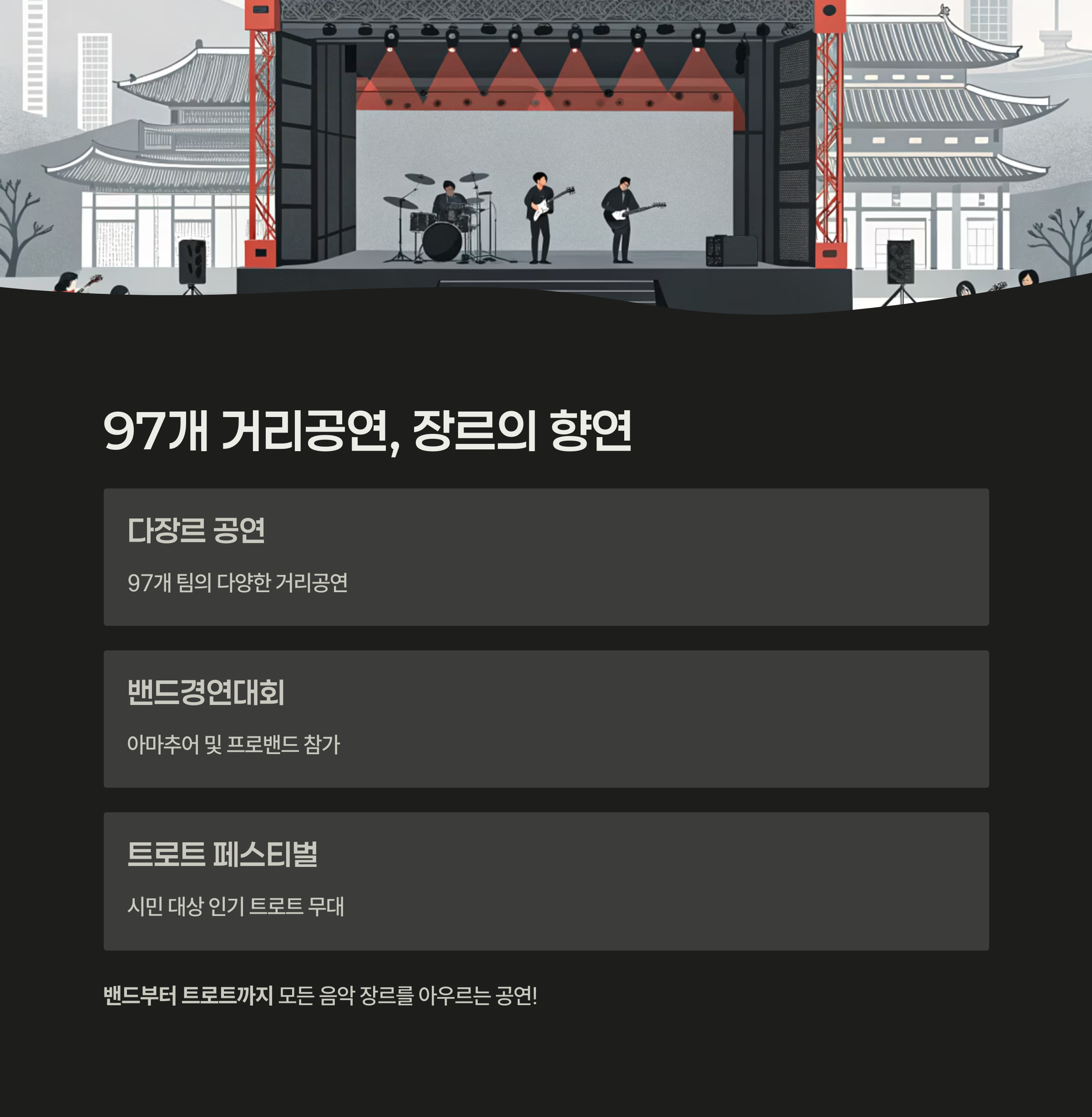 | 거리공연 | 97개 팀이 참여하는 다장르 공연 |
