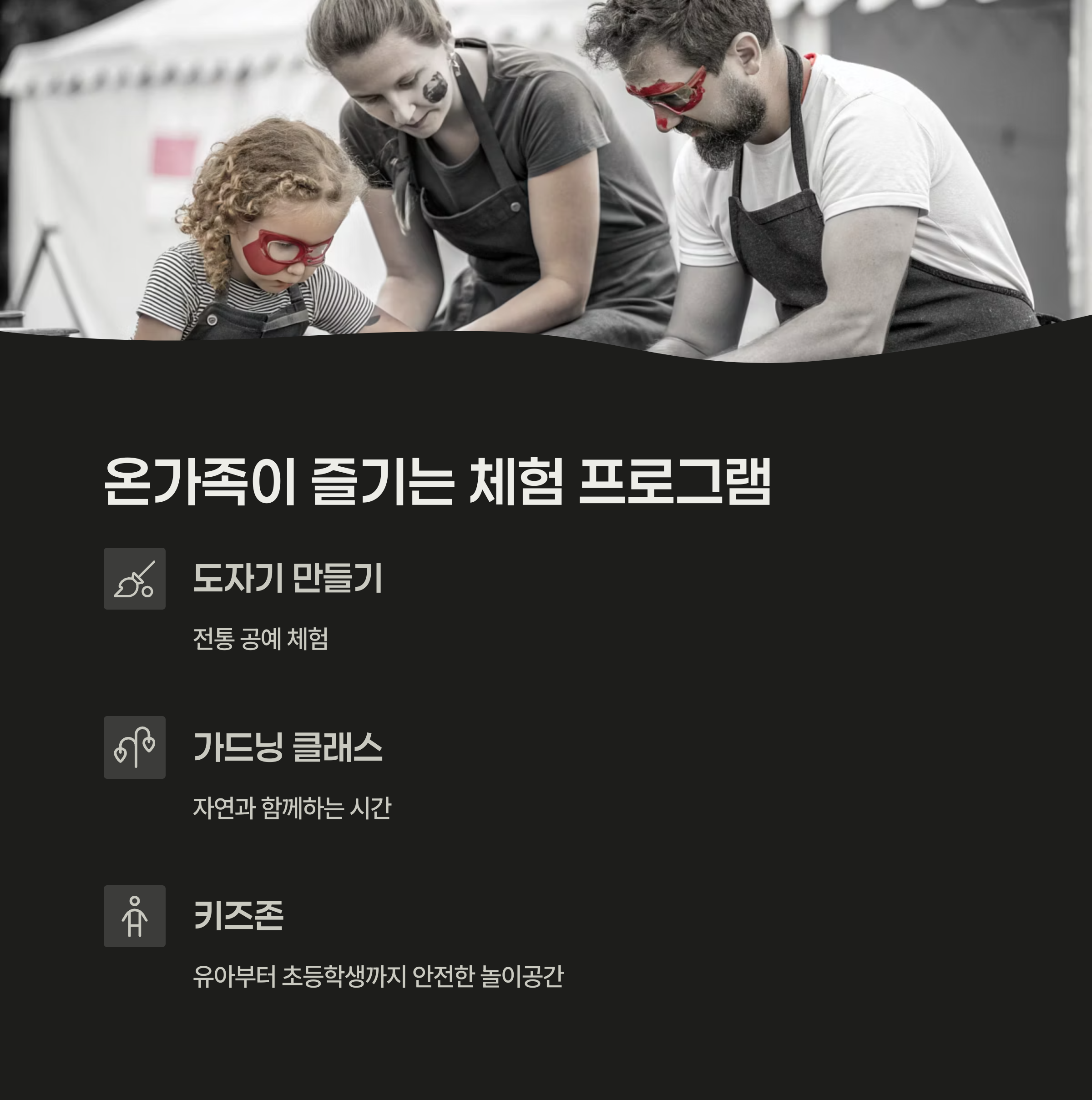 도자기 만들기, 가드닝 클래스, 페이스페인팅, 전통놀이 등