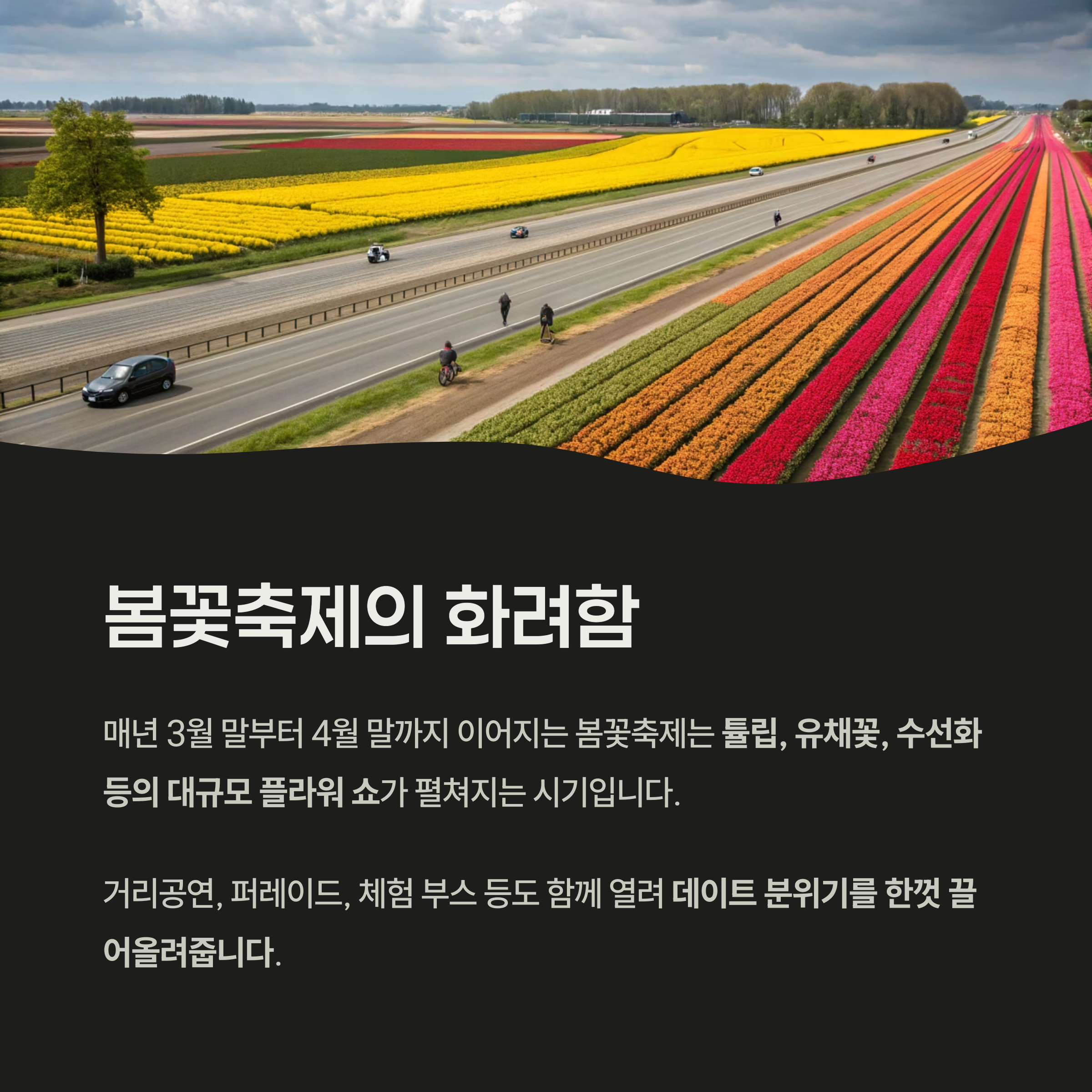 튤립, 유채꽃, 수선화 등의 대규모 플라워 쇼가 펼쳐지는 시기입니다.